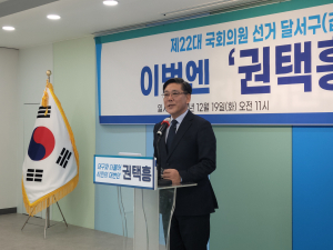 더불어민주당 대구 달서갑 지역위원장을 맡았던 권택흥 달서갑 국회의원선거 예비후보가 출마를 공식 선언했다. 대구 지역 민주당 소속에서는 첫 출마선언이다.권 예비후보는 19일 오전 민주당 대구시당 김대중홀에서 출마기자회견을 열고 “지난 21대 국회의원선거에서 대구의 변화를 응원해주셨던 주민의 열망에도 낙선을 했지만, 포기하지 않고 더 노력하라는 격려로 4년간 오롯이 대구를 지켰다”며 “22대 총선에서 대구의 변화를 바라는 시민과 함께 지역 정치 혁신과 다양성이 보장되는 대구의 시대적 소명을 이뤄가겠다”고 밝혔다.대구에서 30년간 학생·