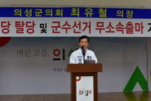 제7회 전국동시지방선거에 무소속으로 출마해 의성군수에 도전하고 있는 최유철 후보가 본격적인 선거운동이 시작된 31일 출정식을 가지고 필승 의지를 다졌다. 이날 오후 7시 KB국민은행 의성출장소 앞에서 열린 출정식은 공연, 선포식, 지지연설, 착복식, 출정 연설 등의 순으로 진행됐다. 이 자리에는 지지자 1100여 명이 함께 했다. 지지연설에 나선 우종우 의성군의회 전 의장은 “의성군의 살림살이를 책임지고, 군민이 행복한 삶을 살 수 있는 공간을 만들어야 할 막중한 책임을 지고 있는 군수는 더욱 강도 높은 청렴성이 요구된다”면서...