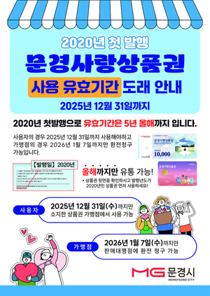 문경시가 2020년에 발행된 문경사랑상품권의 유효기간이 올해 12월 31일 만료됨에 따라 시민들에게 기한 내 사용과 환전을 적극 당부하고 나섰다. 시는 시민의 재산권을 보호하고 지역경제 순환을 촉진하기 위해 다양한 홍보 채널을 통해 안내를 강화하고 있다.문경시는 문경사랑상품권 이용 활성화 조례 제3조에 따라 상품권 유효기간이 발행일로부터 5년으로 한정돼 있어, 2020년 발행된 상품권은 올해 12월 31일자로 사용 기간이 종료된다고 밝혔다.사용 기한을 확인하려면 상품권 뒷면의 발행일을 확인하면 된다.시는 대규모 미사용 상품권 발생을