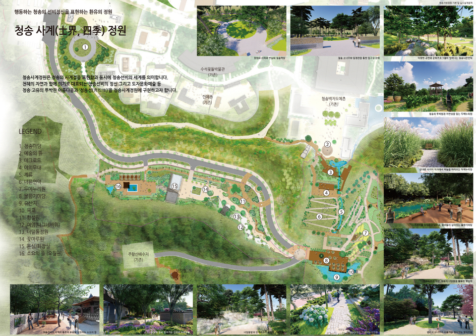 주요 테마는 ‘청송마당’, 도자예술과 문화프로그램이 있는 ‘예술의 뜰’, 청송의 투박함과 자연성을 담은 ‘두메누리원’, 청송의 너덜돌 등 자연소재와 다양한 수목이 어울리는 ‘향설원’, 청송의 선비정신을 표현하는 ‘꽃마루원’, 선비의 사색과 풍류를 상징하는 ‘오월원’ 등 여섯 가지로 구성된다.