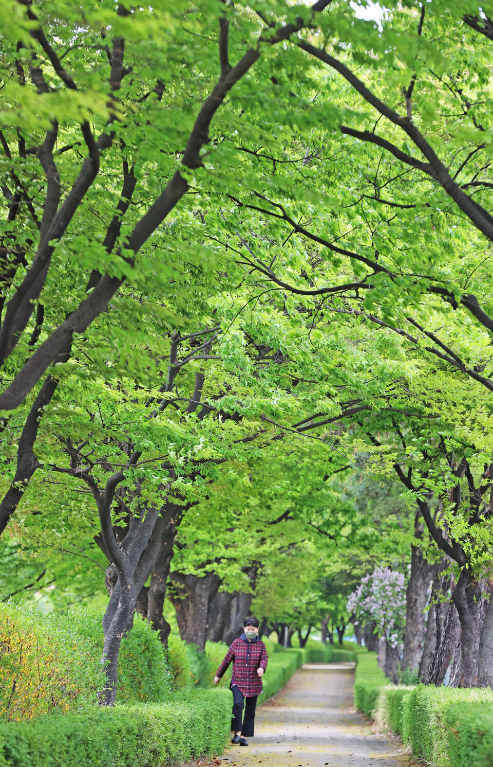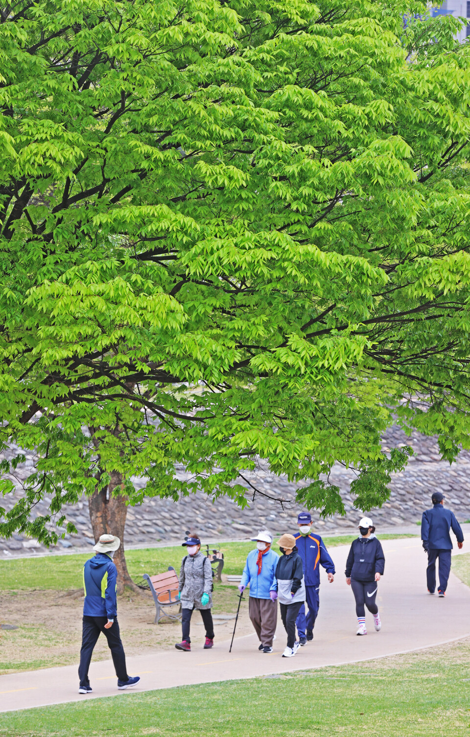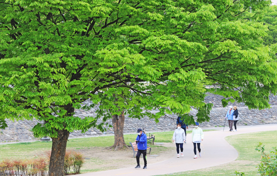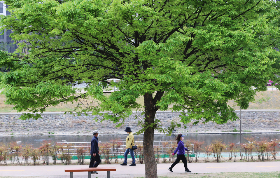 흐린 날씨를 보이며 때이른 더위가 주춤한 13일 대구 신천 둔치를 찾은 시민이 푸른 신록 아래 산책을 하고 있다.