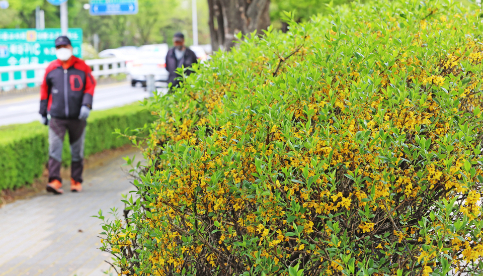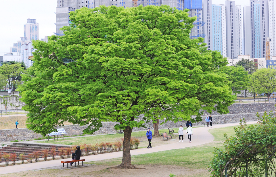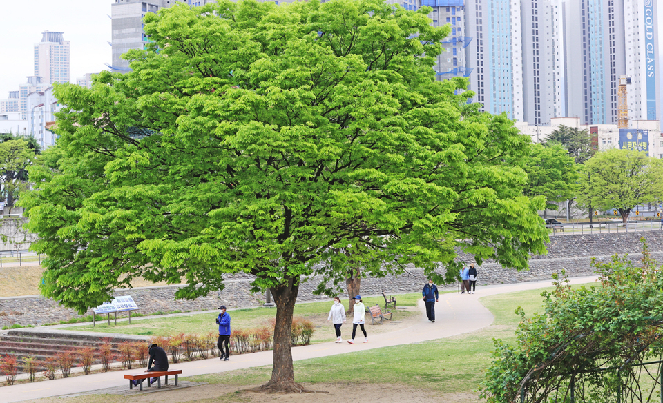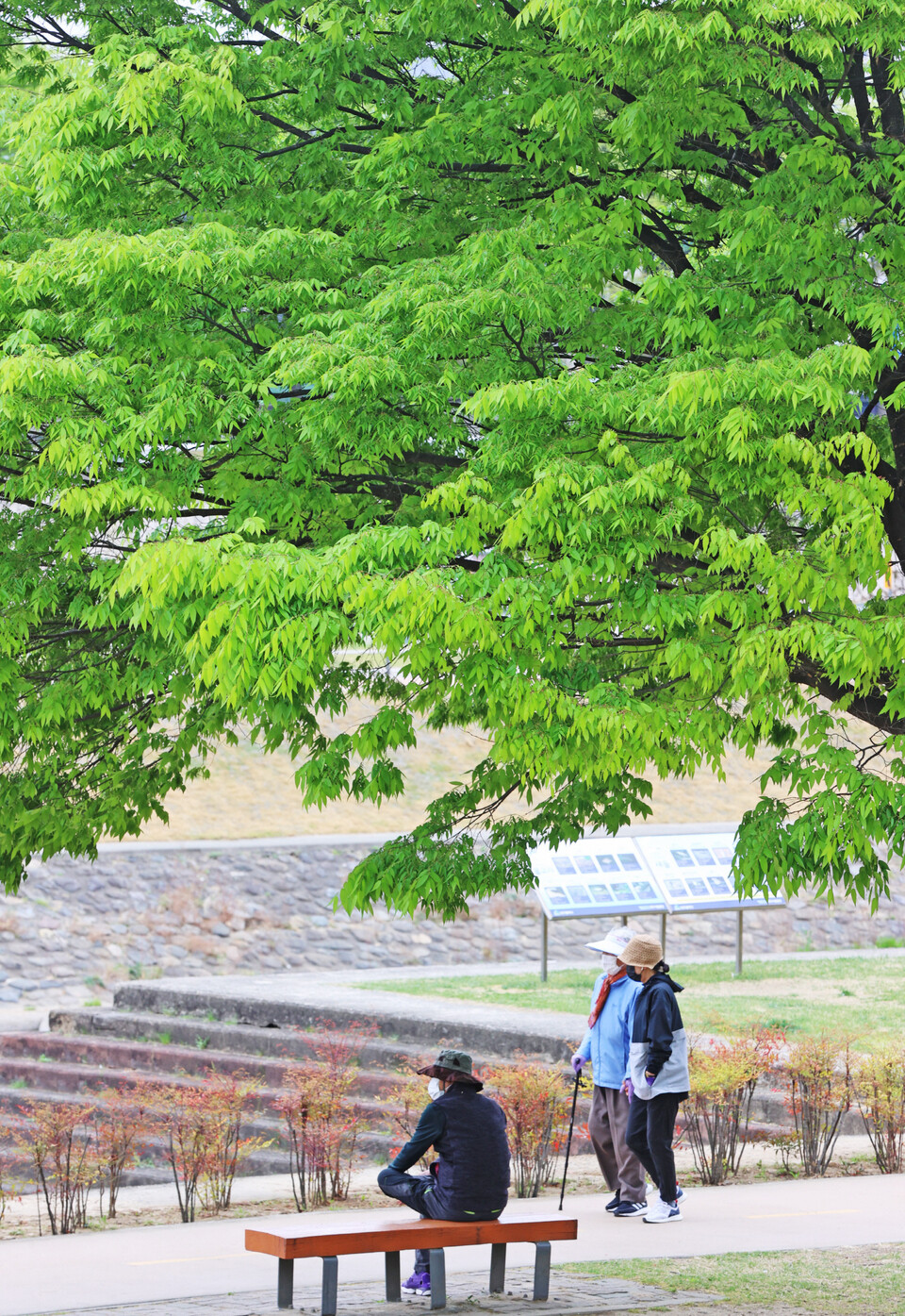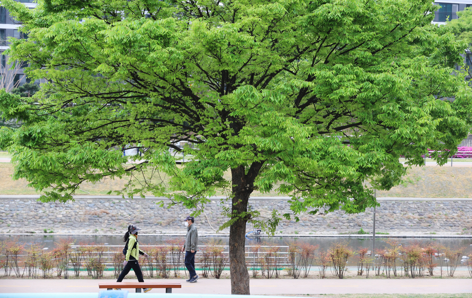 흐린 날씨를 보이며 때이른 더위가 주춤한 13일 대구 신천 둔치를 찾은 시민이 푸른 신록 아래 산책을 하고 있다.