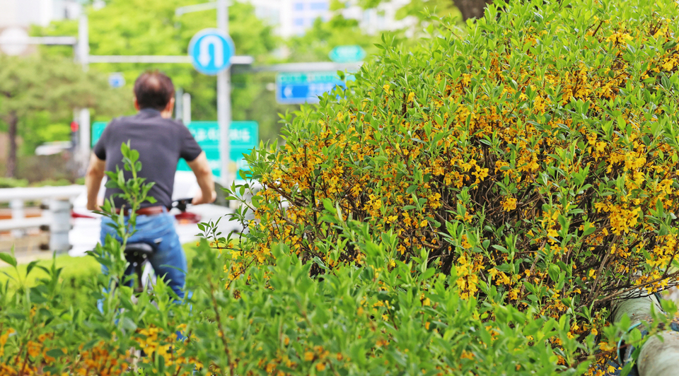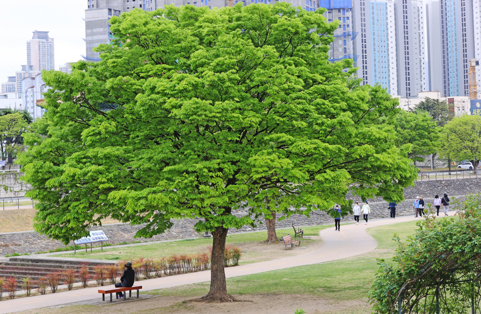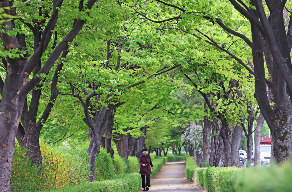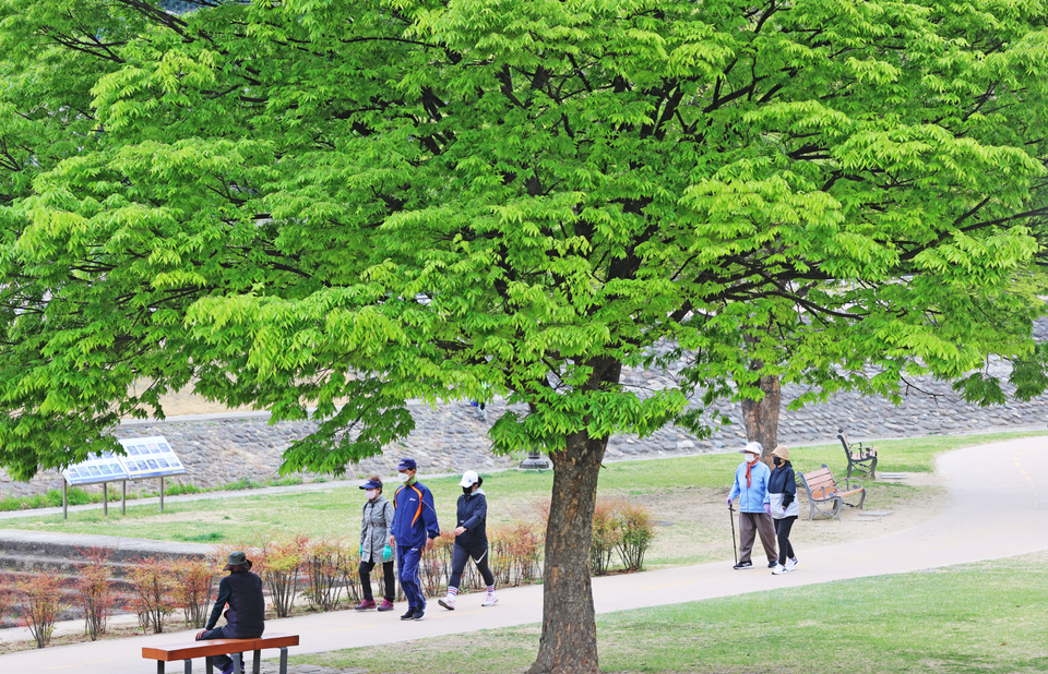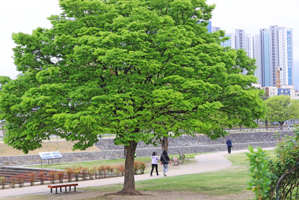 흐린 날씨를 보이며 때이른 더위가 주춤한 13일 대구 신천 둔치를 찾은 시민이 푸른 신록 아래 산책을 하고 있다. 박영제기자 yj56@kyongbuk.com