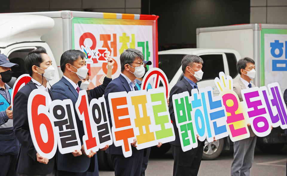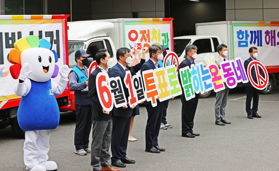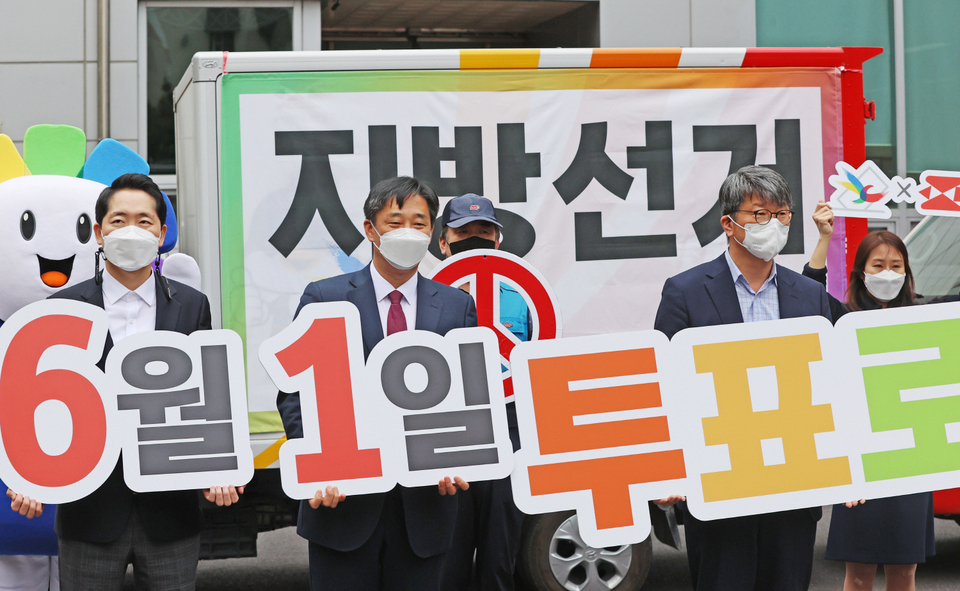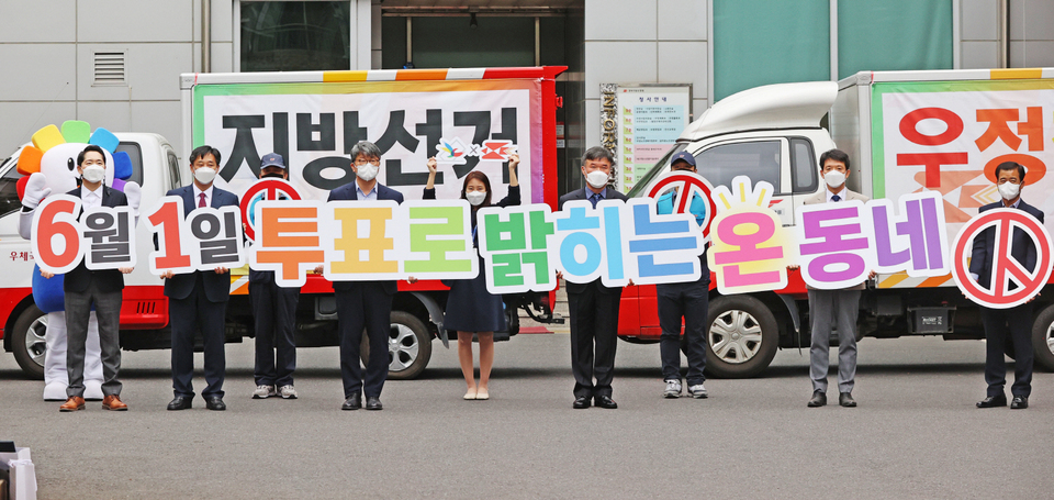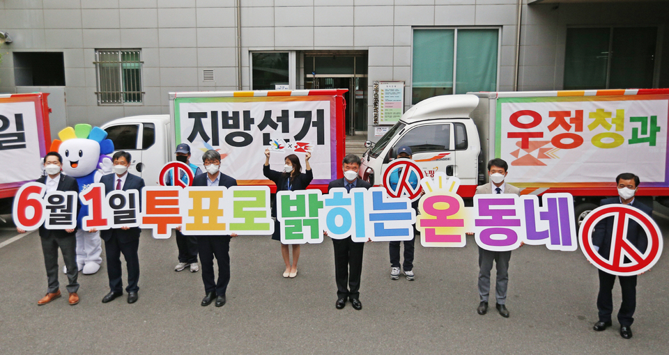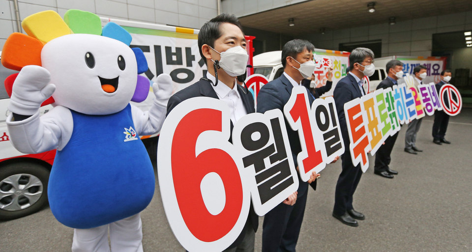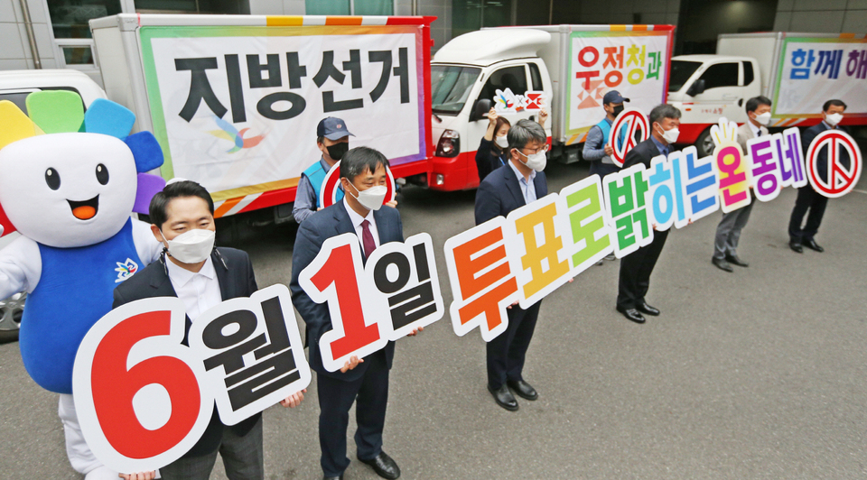 제8회 전국동시지방선거를 48일 앞둔 14일 오후 대구시선거관리위원회와 경북지방우정청 관계자들이 우정청사에서 피켓을 들고 지방선거 투표 독려 홍보 퍼포먼스를 하고 있다. 박영제 기자 yj56@kyongbuk.com