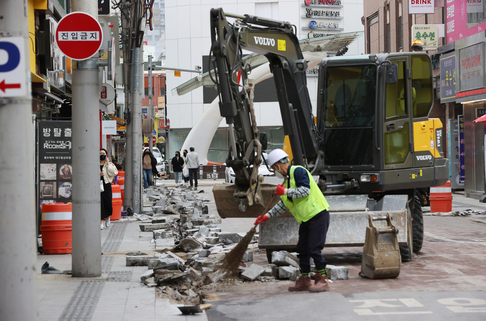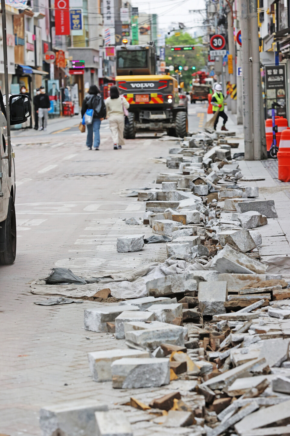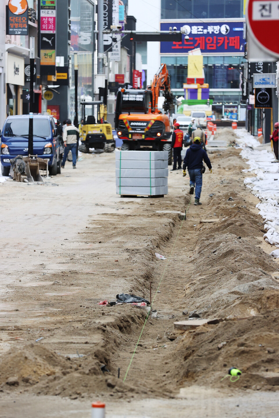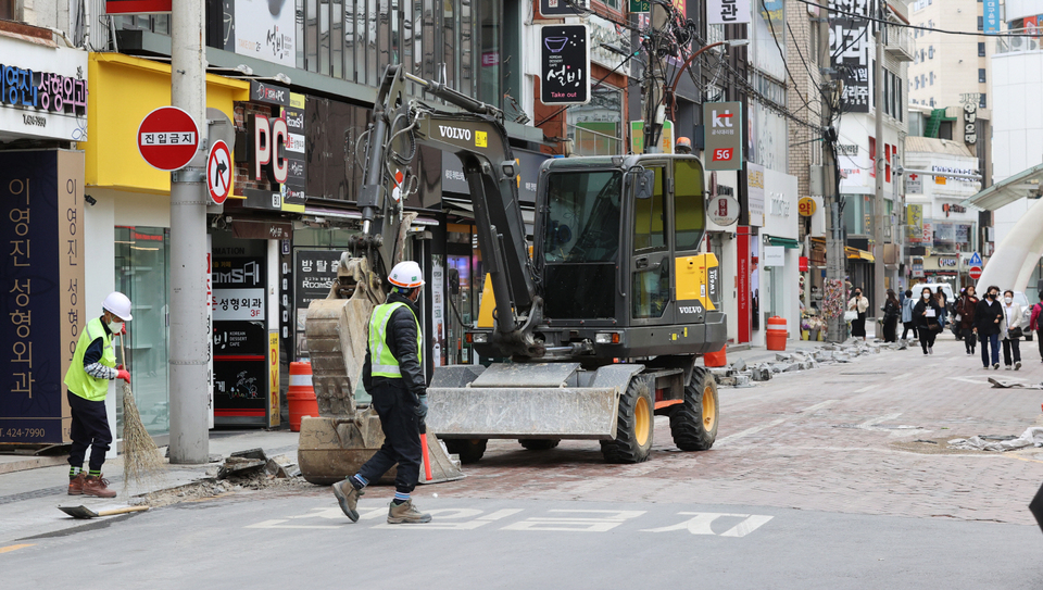 14일 대구 중구 동성로에 보행환경 개선사업 관련 공사가 한창이다. 이번 개선 사업은 차량 감속유도를 위해 차도폭 감소, 고원식 횡단보도 등을 설치하고 보행로의 폭을 확대하여 보행자 안전 및 편의성을 개선하고, 동시에 훼손된 하수도 시설 정비도 진행함으로써 강우 시에도 쾌적한 보행환경을 제공하기 위해 시행됐다. 박영제 기자 yj56@kyongbuk.com