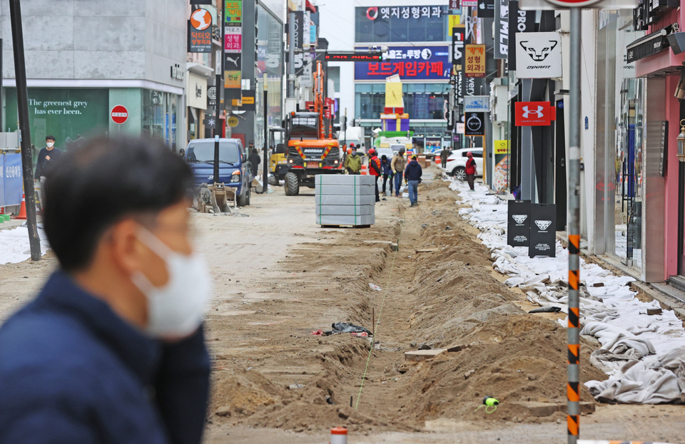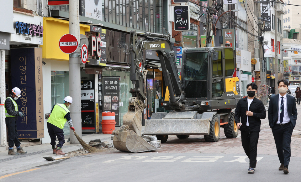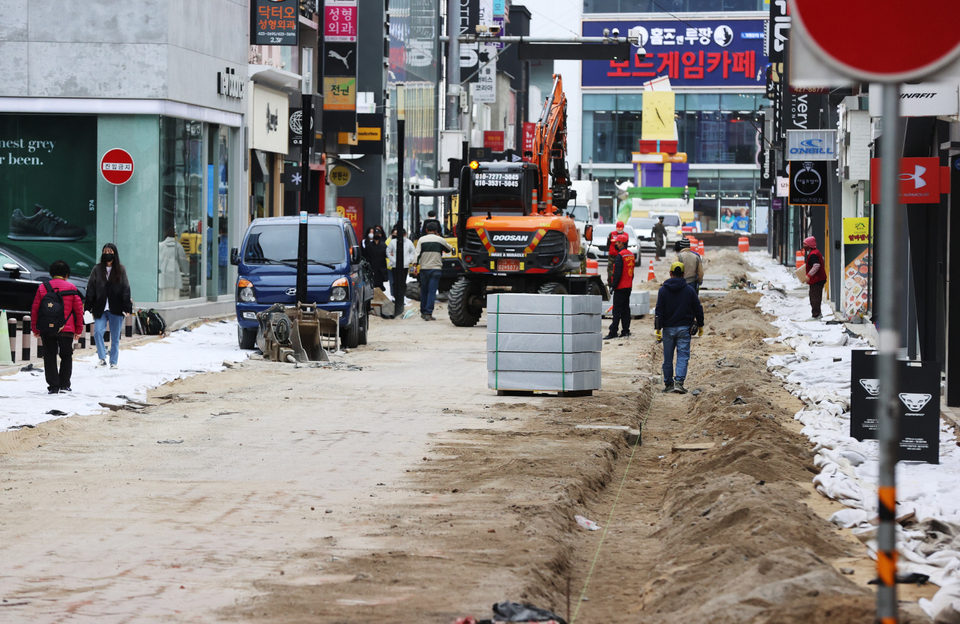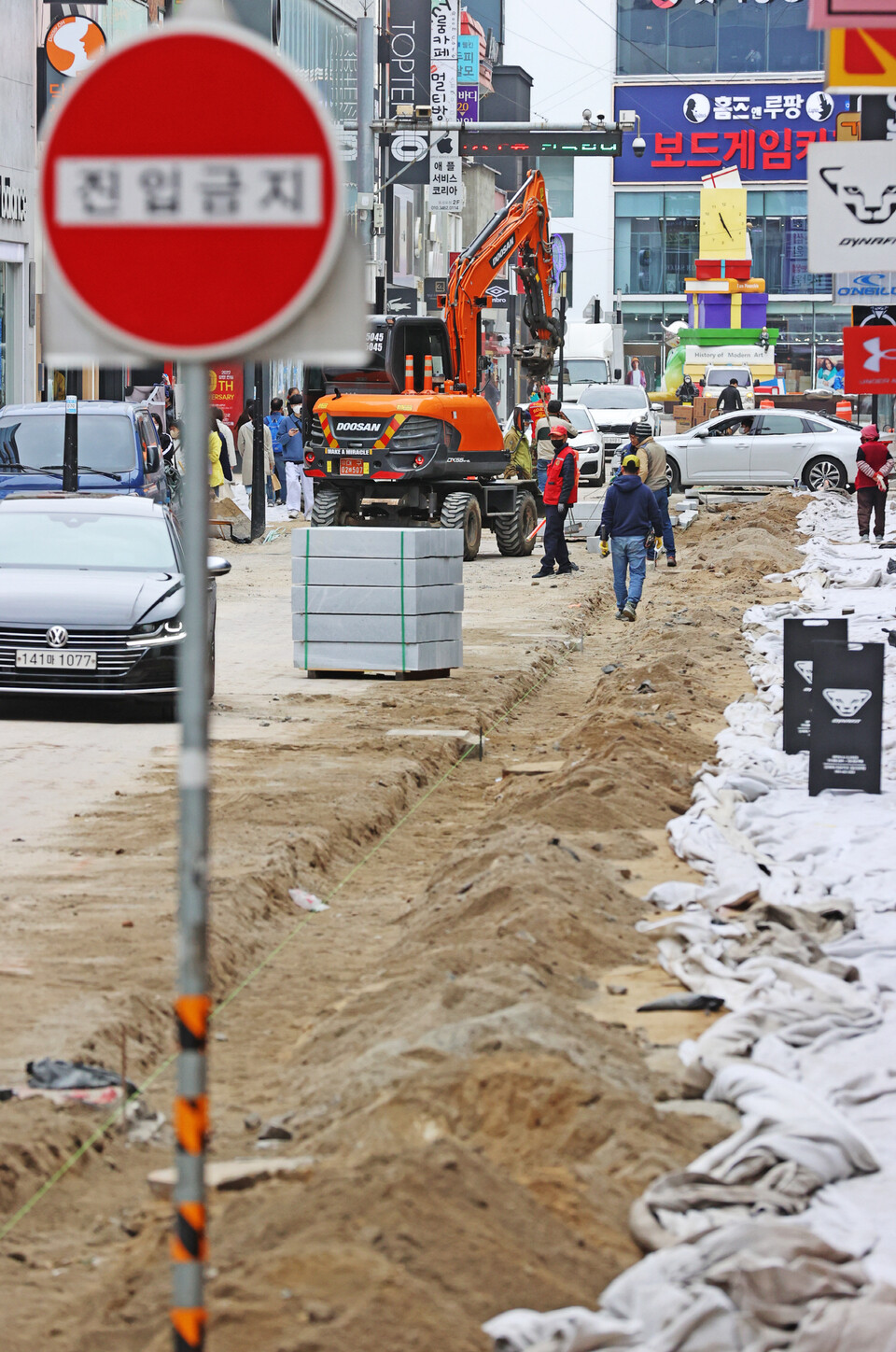 14일 대구 중구 동성로에 보행환경 개선사업 관련 공사가 한창이다. 이번 개선 사업은 차량 감속유도를 위해 차도폭 감소, 고원식 횡단보도 등을 설치하고 보행로의 폭을 확대하여 보행자 안전 및 편의성을 개선하고, 동시에 훼손된 하수도 시설 정비도 진행함으로써 강우 시에도 쾌적한 보행환경을 제공하기 위해 시행됐다. 박영제 기자 yj56@kyongbuk.com