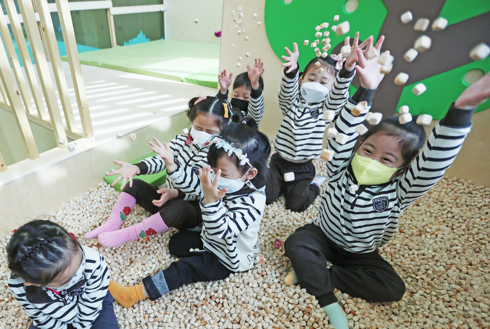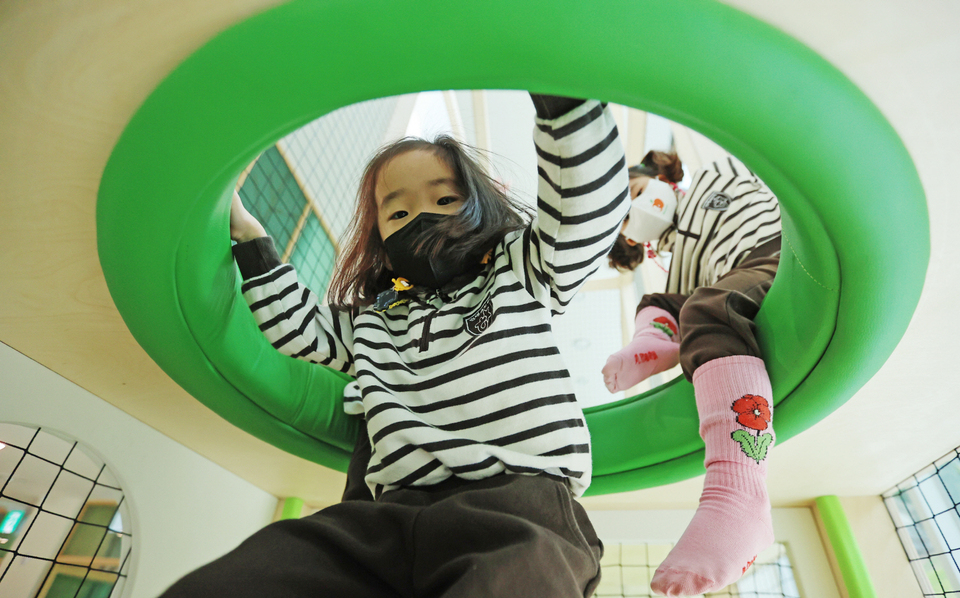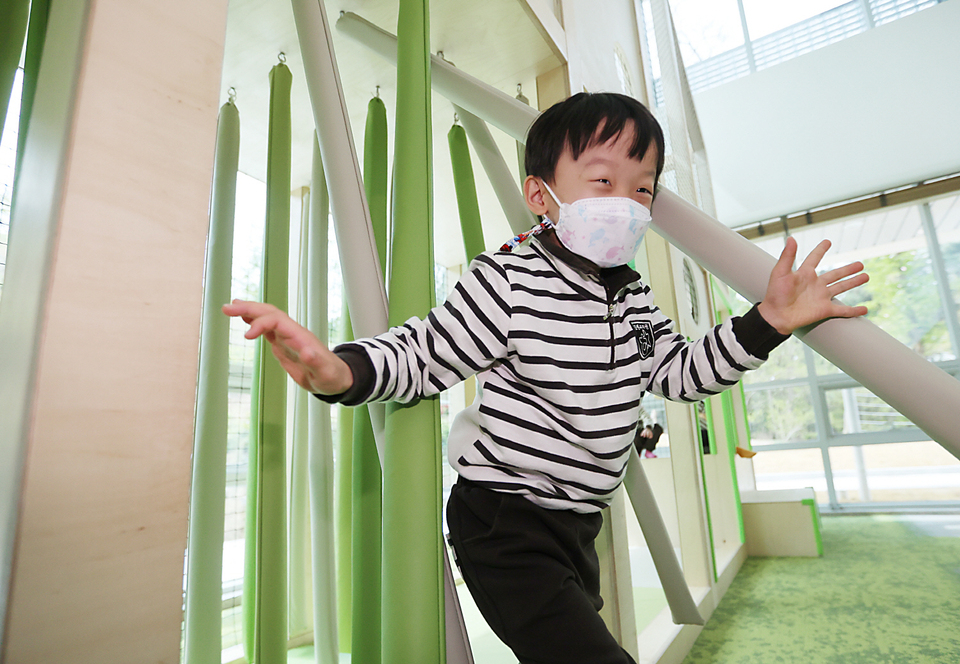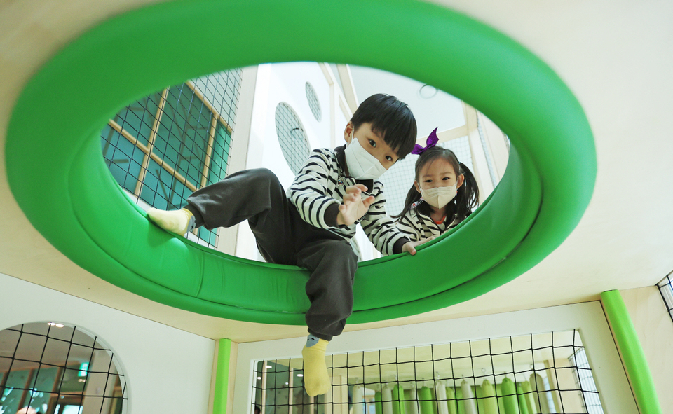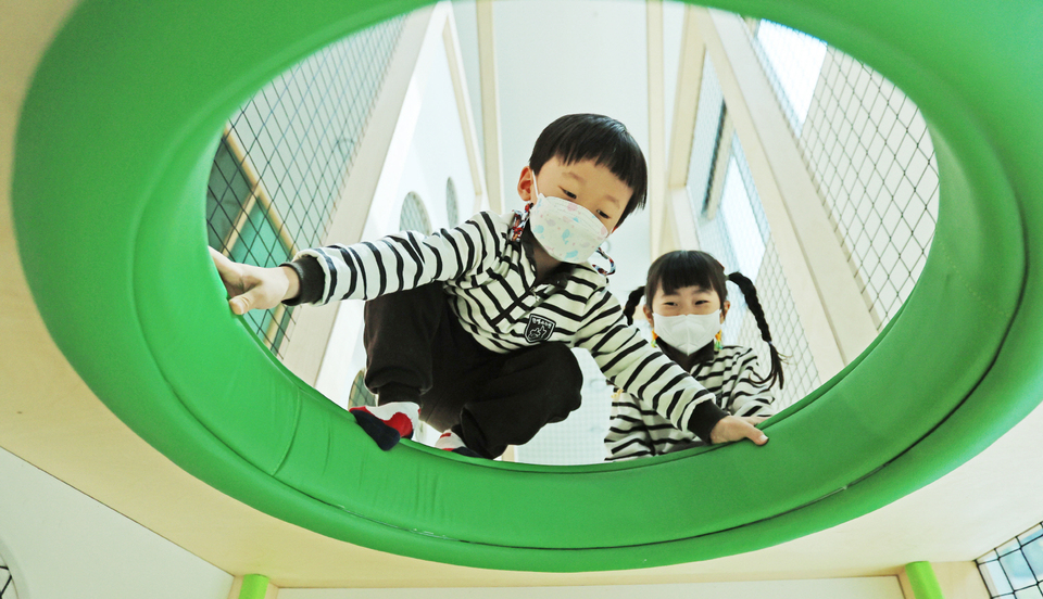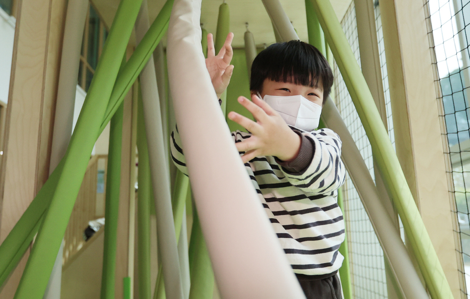 거리두기가 해제된 18일 오전 대구 달서구 달서목재문화관을 찾은 어린이들이 실내 놀이터에서 신나게 뛰어 놀고 있다. 목재문화관은 거리두기 해제에 맞춰 어린이집, 유치원 등의 단체 예약을 시작했고, 나무상상놀이터는 유아 20명, 만들기체험은 12명까지 예약이 가능하다.