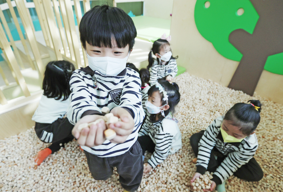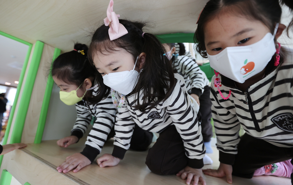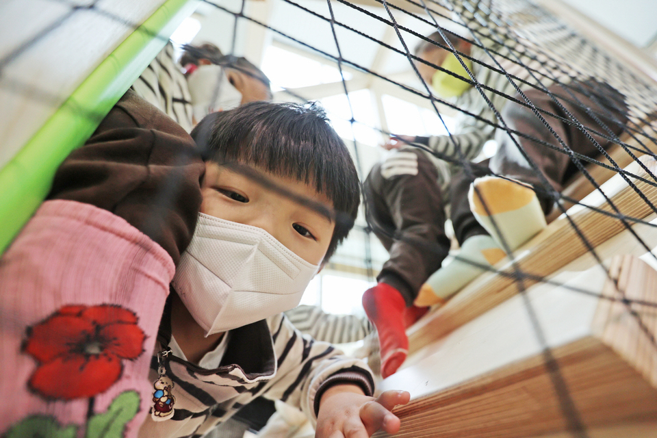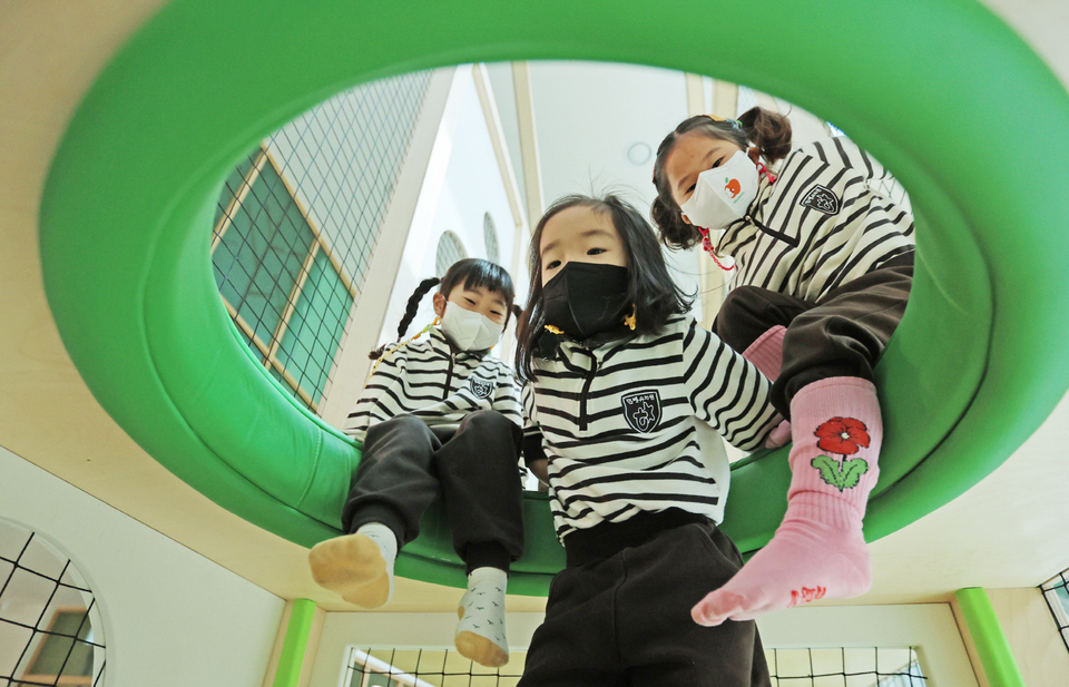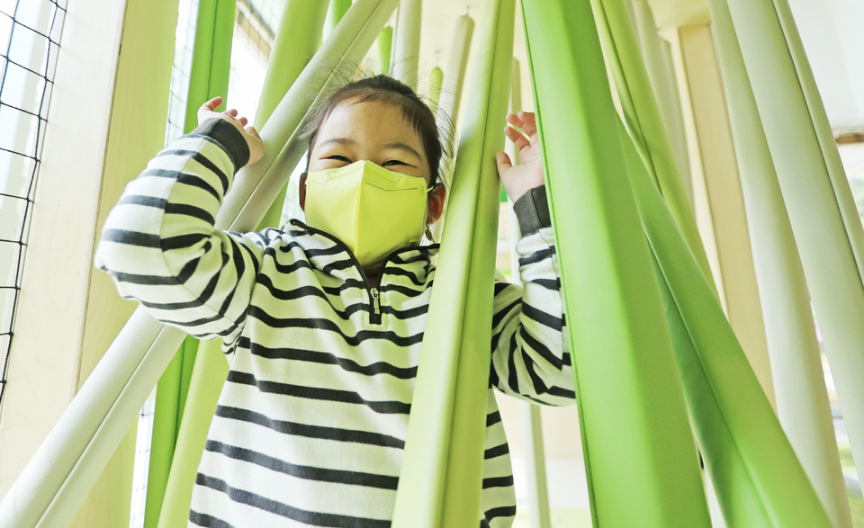 거리두기가 해제된 18일 오전 대구 달서구 달서목재문화관을 찾은 어린이들이 실내 놀이터에서 신나게 뛰어 놀고 있다. 목재문화관은 거리두기 해제에 맞춰 어린이집, 유치원 등의 단체 예약을 시작했고, 나무상상놀이터는 유아 20명, 만들기체험은 12명까지 예약이 가능하다.