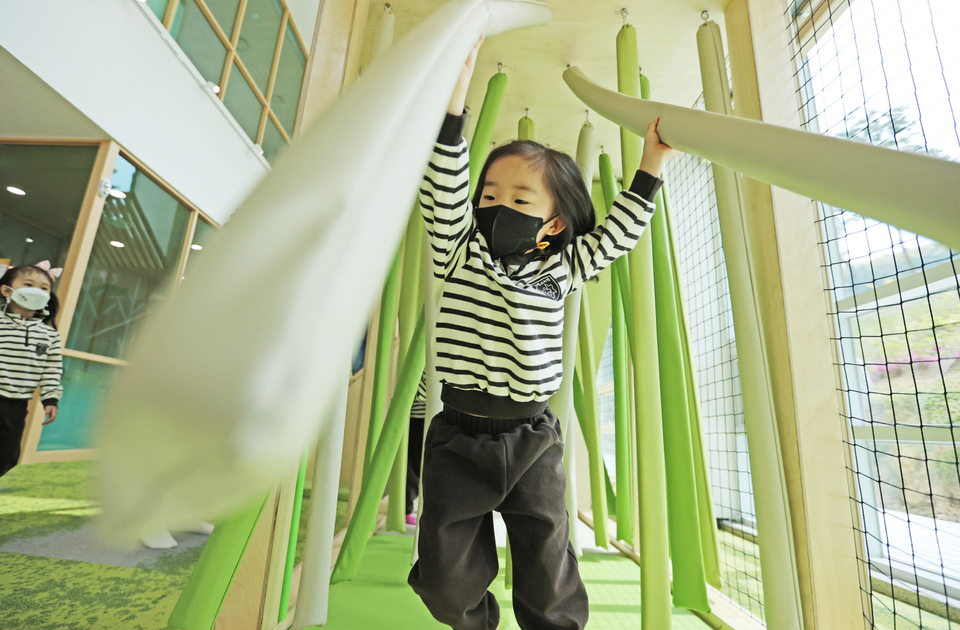 거리두기가 해제된 18일 오전 대구 달서구 달서목재문화관을 찾은 어린이들이 실내 놀이터에서 신나게 뛰어 놀고 있다. 목재문화관은 거리두기 해제에 맞춰 어린이집, 유치원 등의 단체 예약을 시작했고, 나무상상놀이터는 유아 20명, 만들기체험은 12명까지 예약이 가능하다. 박영제 기자 yj56@kyongbuk.com