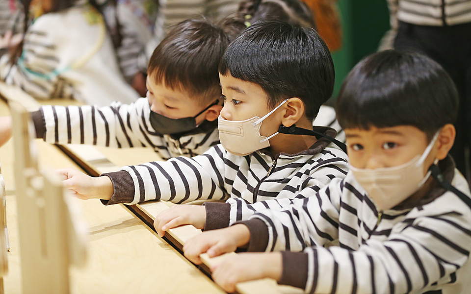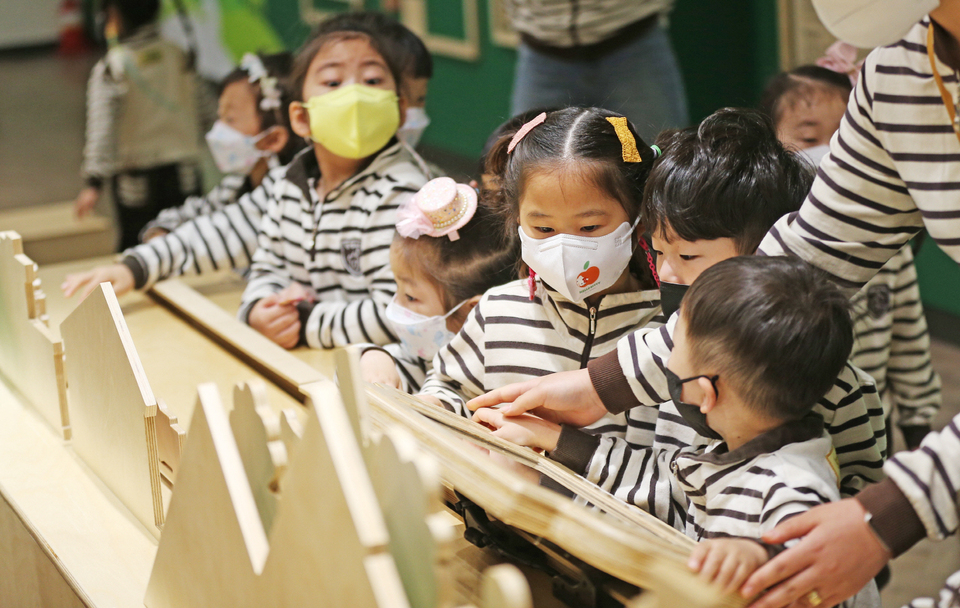 거리두기가 해제된 18일 오전 대구 달서구 달서목재문화관을 찾은 어린이들이 실내 놀이터에서 목재체험을 하고 있다. 목재문화관은 거리두기 해제에 맞춰 어린이집, 유치원 등의 단체 예약을 시작했고, 나무상상놀이터는 유아 20명, 만들기체험은 12명까지 예약이 가능하다. 박영제 기자 yj56@kyongbuk.com