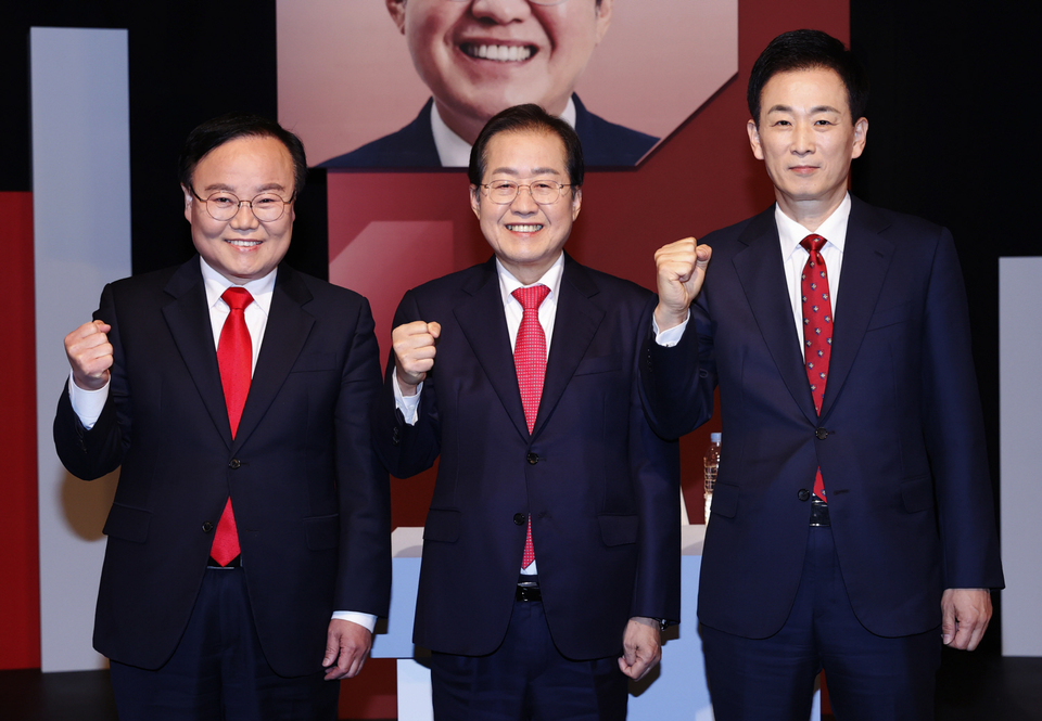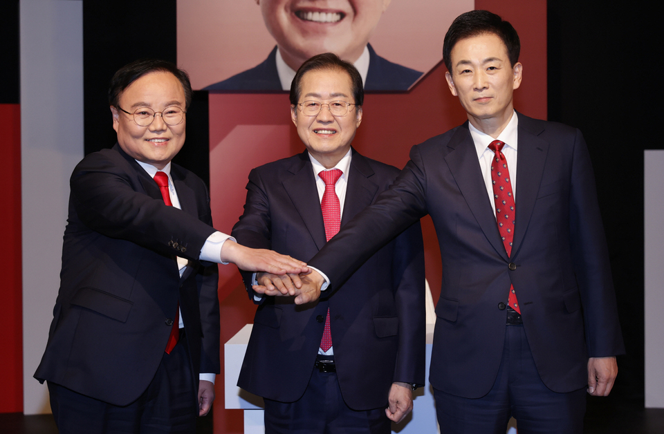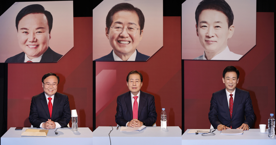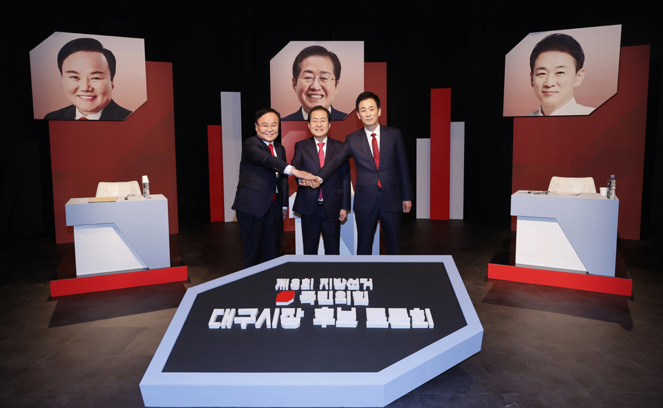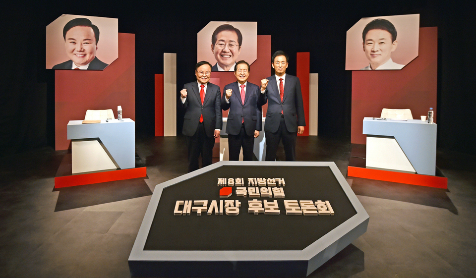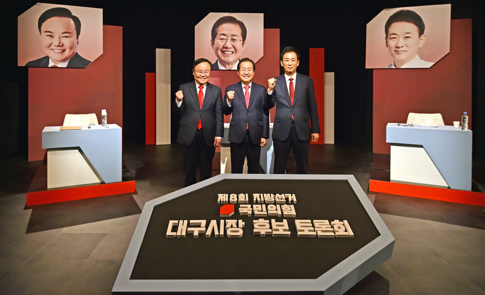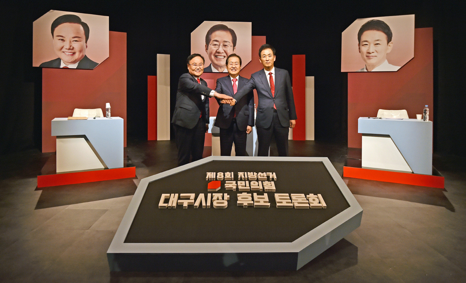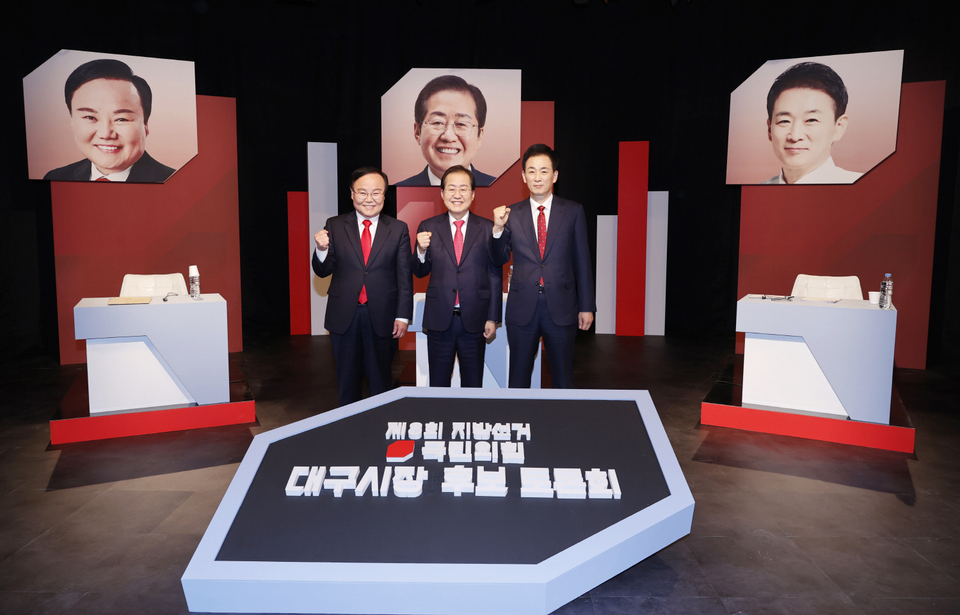 19일 오후 대구 수성구 두산동 TBC에서 열린 ‘대구시장 국민의힘 경선 후보 토론회’에서 김재원 전 최고위원, 홍준표 의원, 유영하 변호사가 토론에 앞서 기념촬영을 하고 있다.