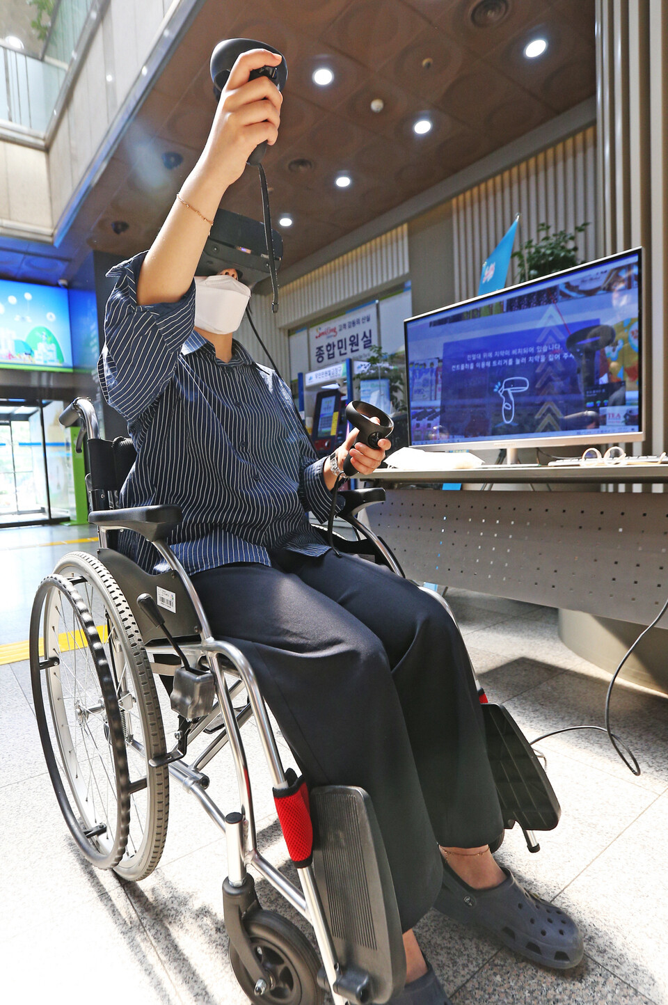 제42회 장애인의 날을 맞아 20일 오전 대구 달서구청 1층 로비에서 열린 ‘장애공감 체험행사’를 찾은 시민이 휠체어에 앉아 지체시각장애 가상현실(VR) 체험활동에 참여하고 있다. 박영제기자 yj56@kyongbuk.com