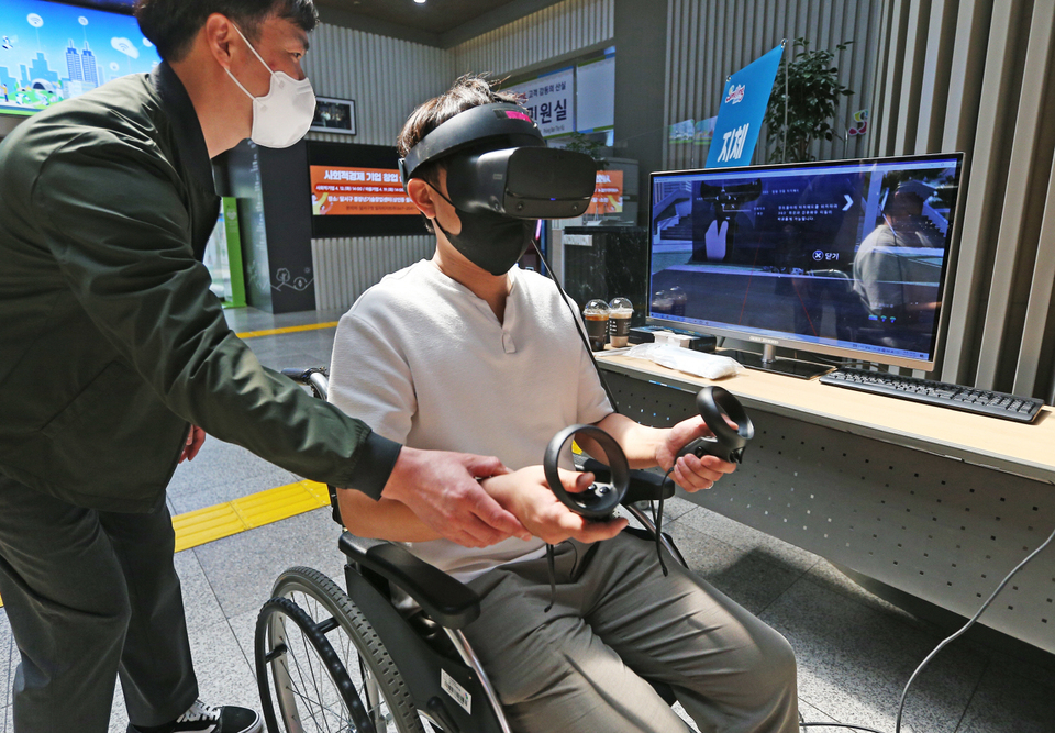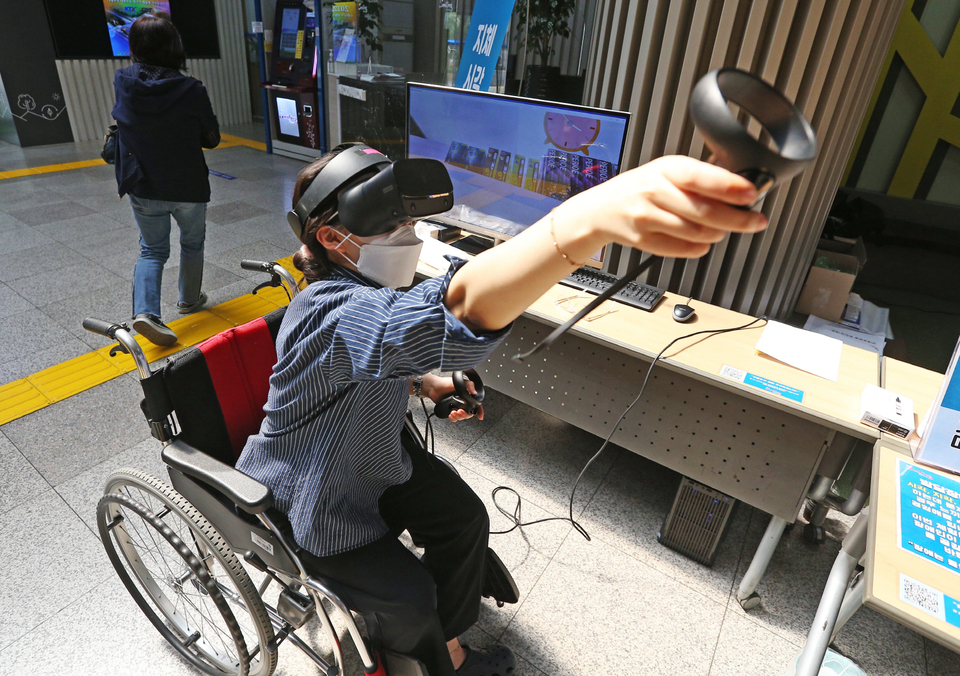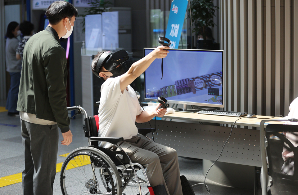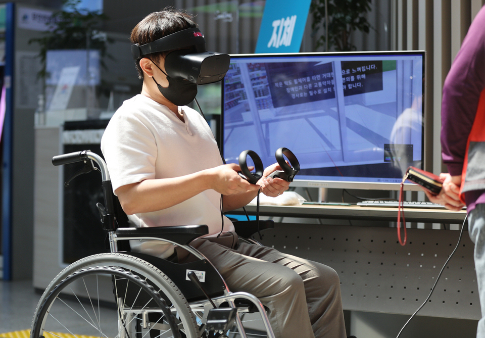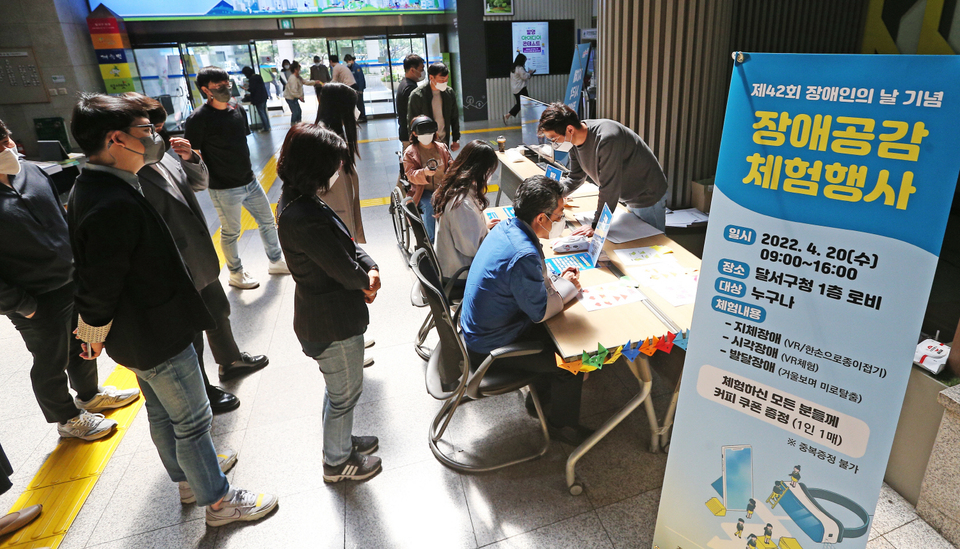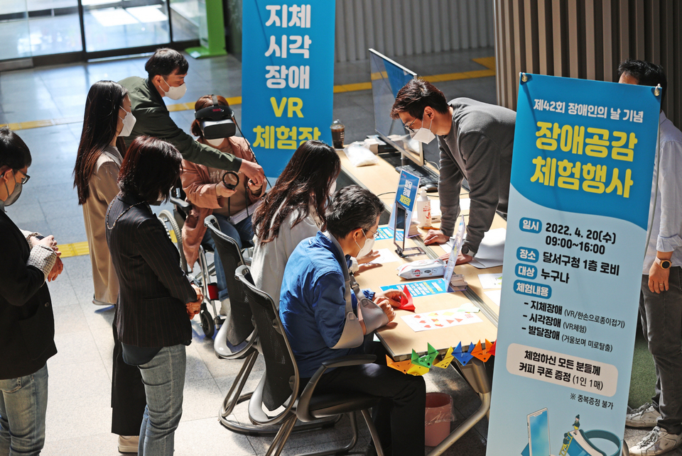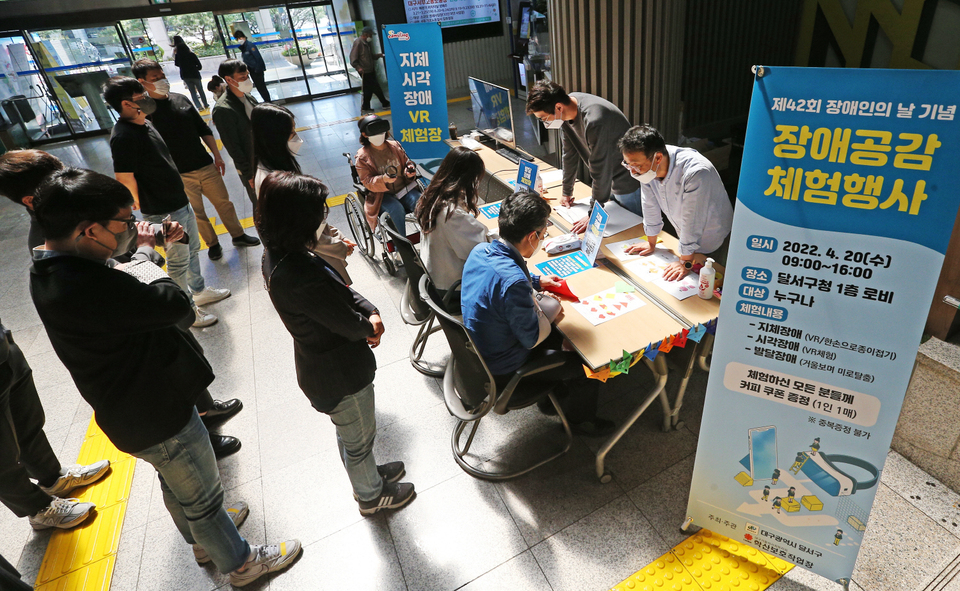 제42회 장애인의 날을 맞아 20일 오전 대구 달서구청 1층 로비에서 열린 ‘장애공감 체험행사’를 찾은 시민이 지체장애, 발달장애, 지체시각장애 VR체험을 하고 있다.