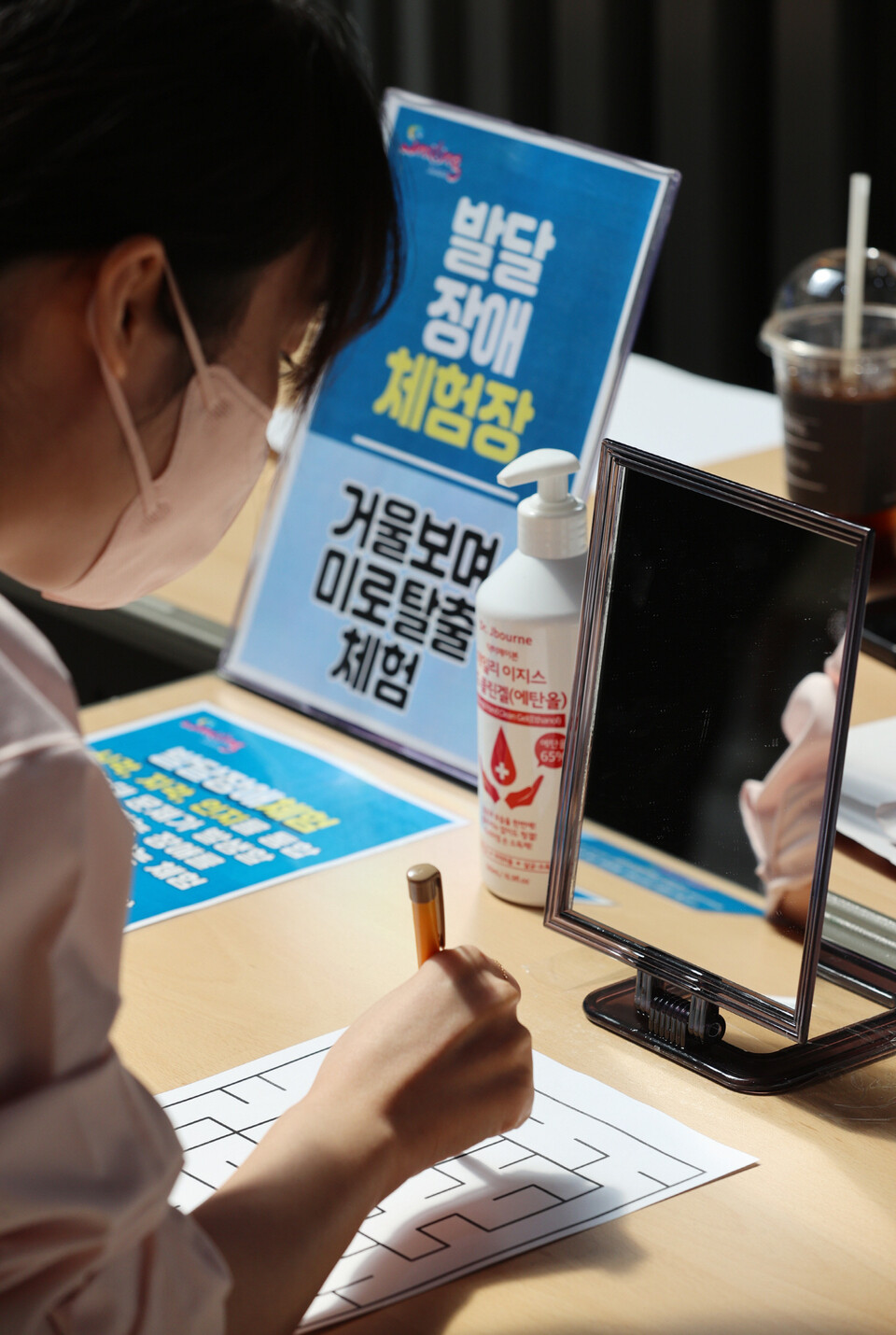 제42회 장애인의 날을 맞아 20일 오전 대구 달서구청 1층 로비에서 열린 ‘장애공감 체험행사’를 찾은 시민이 거울보고 미로를 탈출하는 발달장애 체험활동을 하고 있다. 박영제기자 yj56@kyongbuk.com