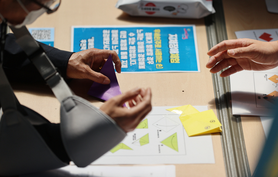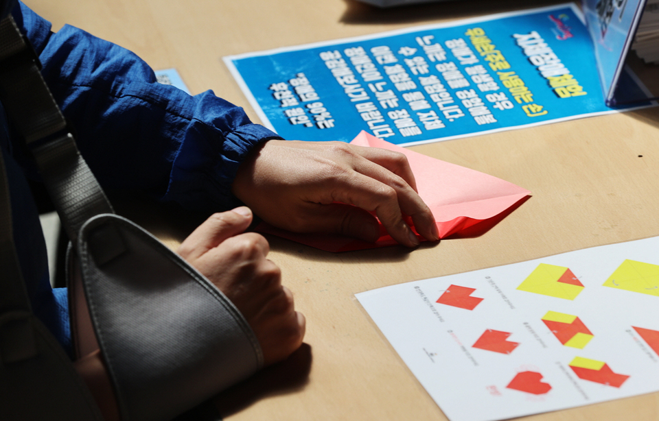 제42회 장애인의 날을 맞아 20일 오전 대구 달서구청 1층 로비에서 열린 ‘장애공감 체험행사’를 찾은 시민이 왼손으로 종이접기를 하는 지체장애 체험활동을 하고 있다. 박영제기자 yj56@kyongbuk.com