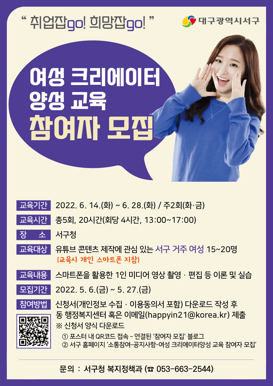여성 크리에이터 양성 교육 운영 포스터. 서구청 제공. 대구 서구청은 오는 6월 14일부터 28일까지 유튜브 등 1인 미디어 콘텐츠 제작에 관심 있는 여성들을 대상으로 ‘여성 크리에이터 양성 교육’ 과정을 운영한다고 8일 밝혔다.이번 사업은 지역 경력단절여성들의 경제활동 참여기반을 조성하고자 마련됐다.교육과정은 1인 미디어 영상 이해 및 제작 기획, 스마트폰을 활용한 영상 촬영·편집·내레이션 녹음 실습과정 등이다. 매주 화요일과 금요일 4시간씩 5회(총 20시간)로 구성됐다.신청 요건은 스마트폰을 소지하고 서구에 주소를 둔 여성이면 누구나 가능하다. 자세한 사항은 서구청 홈페이지를 참고하면 된다.