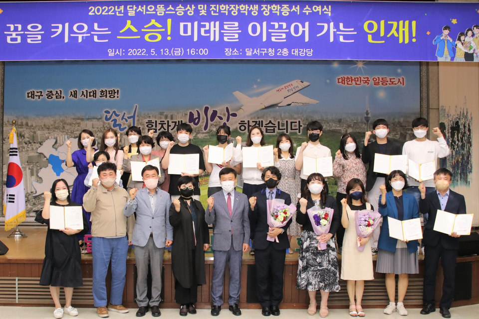 (재)달서인재육성장학재단은 지난 13일 달서구청 대강당에서 초·중·고 우수교사 3명에게 달서으뜸스승상을 시상하고, 2022년 대입에서 우수한 성적을 거둔 진학장학생 13명에게 장학금을 전달했다.