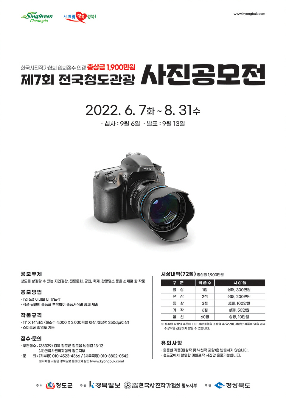 청도를 상징할 수 있는 특산품·풍습·생활상 등을 소재로 한 작품으로 2017년 9월 1일 이후 본인이 직접 촬영한 작품으로 오는 8월 31일까지 작품을 접수 받는다.