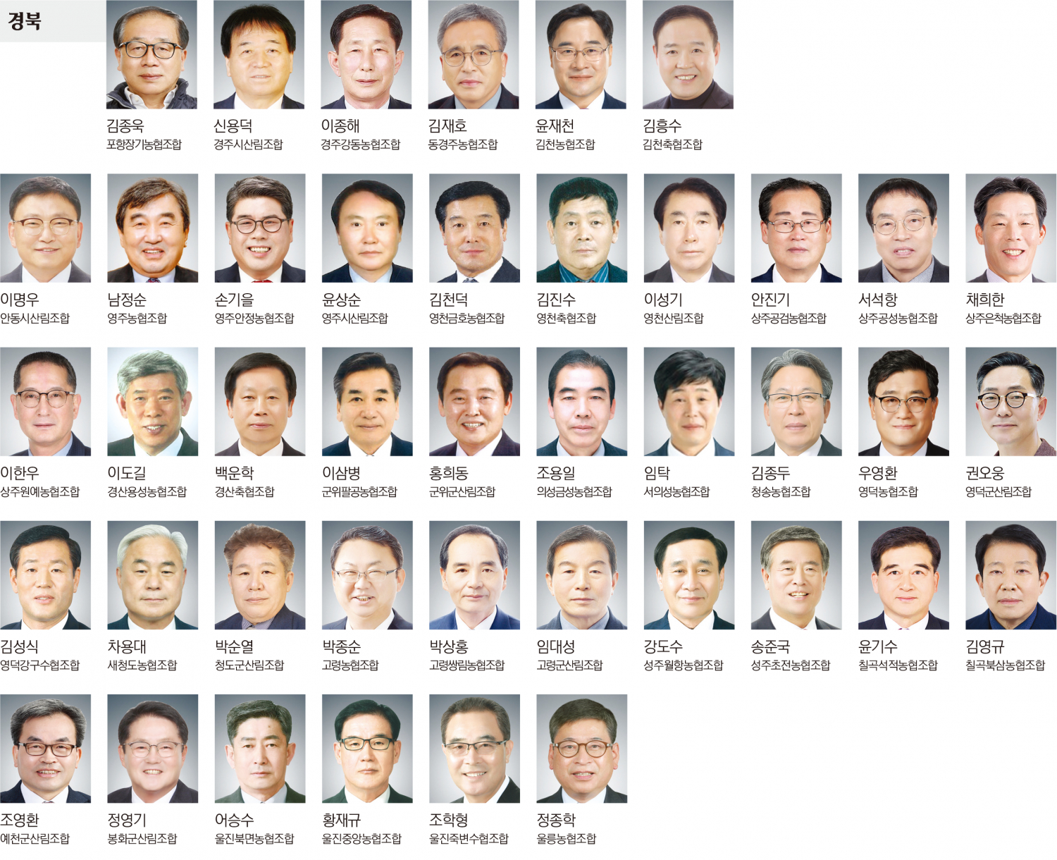 ○경주 △경주시산림조합장 신용덕(68) 현 조합장 △강동농업협동조합 이종해(71) 현 조합장 △동경주농업협동조합 김재호 현 조합장