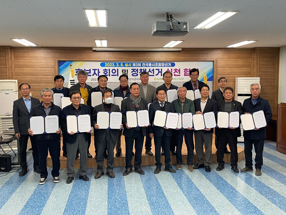 이번 협약식에는 제3회 전국동시 조합장선거의 모든 후보자가 참여해 매니페스토 정책선거 협약서에 서명하고 기념 촬영을 했으며, 지역에서 정책선거가 정착될 수 있도록 노력을 다하겠다고 다짐했다.