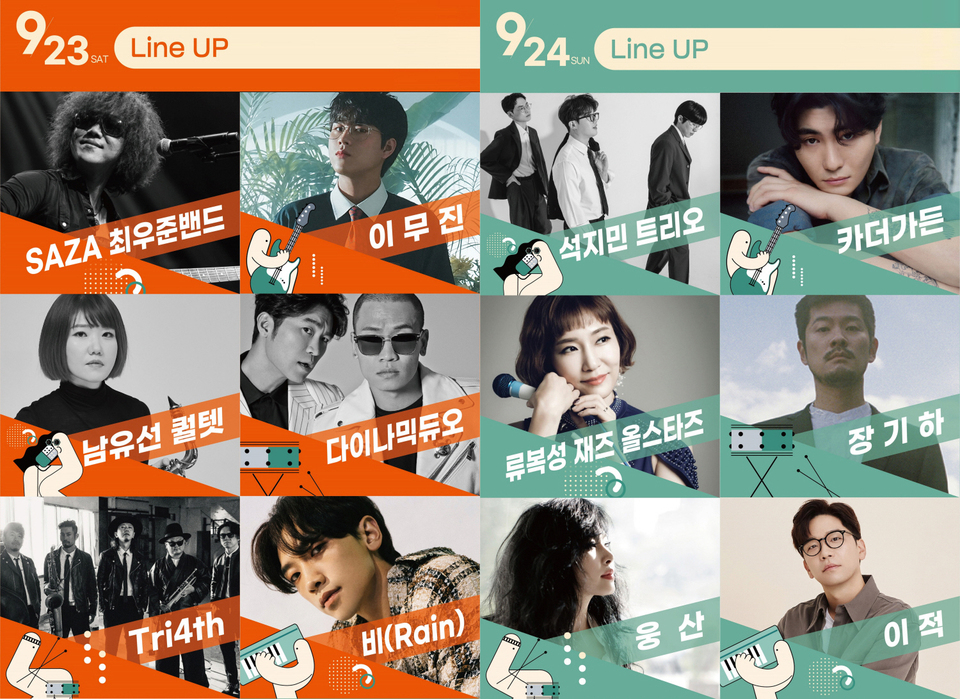 23일 첫날 공연은 한국이 낳은 월드스타 ‘비’를 비롯해 국내 힙합씬의 전설 ‘다이나믹 듀오’, 올라운더 싱어송라이터 ‘이무진’, 화려한 테크닉의 최강 재즈 퀸텟 ‘TRI4TH’, 남유선 퀼텟, SAZA 최우준밴드가 화려한 무대를 선보인다.