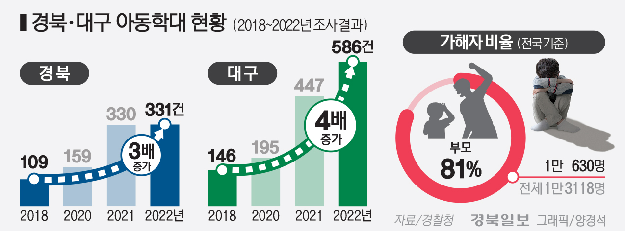 12일 국회 행정안전위원회 소속 국민의힘 김용판(대구 달서구병) 의원이 경찰청으로부터 받은 자료에 따르면, 경북에서 아동학대로 검거된 건수는 지난 2018년 109건이었으나 지난해에는 331건으로 급증했다. 특히 대구는 같은 기간 146건에서 586건으로, 아동학대 검거 건수가 무려 4배 이상 늘었다.