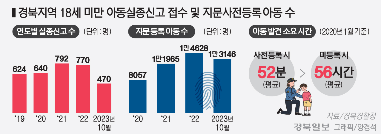 경북경찰청의 적극적인 홍보 등으로 매년 지문 등록 참여가 높아지고 올해 10월 말 기준 경북지역의 18세 미만 아동 지문 사전등록 대상자는 33만3822 명으로 이중 실제 등록을 한 아동수는 25만4207 명으로 76.2%를 기록했다.