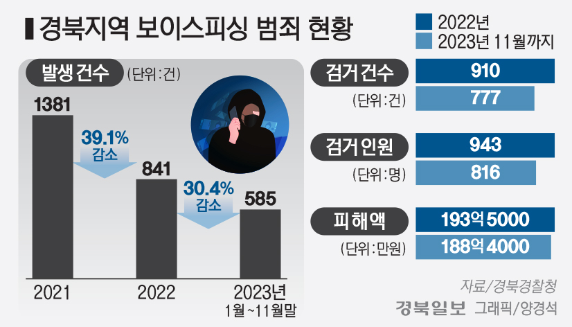 25일 경북경찰청에 따르면 도내 보이스 피싱 발생 건수는 지난 2021년 1381건에서 지난해 841건으로 39.1% 이상 감소,올해 1월부터~11월 말까지 발생 건수도 585 건( 30.4%)으로 줄었다.