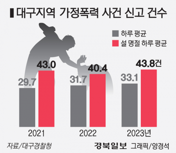 대구경찰청이 29일부터 다음 달 12일까지 ‘설 명절 가정폭력 대응강화 계획’을 추진한다. 해마다 가정폭력 신고가 늘어나고 있는 데다 명절 기간에 신고가 약 30% 급증하는 상황에 맞춰 엄정 대응하겠다는 방침이다.