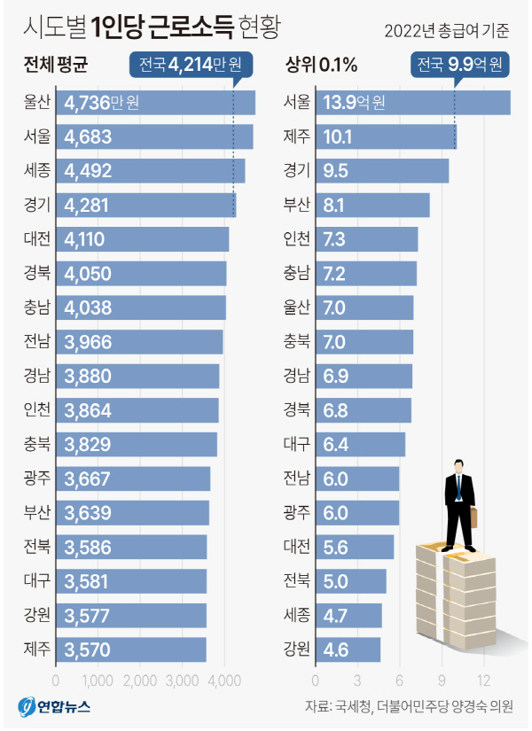 28일 국회 기획재정위원회 소속 더불어민주당 양경숙 의원이 국세청에서 받은 ‘2022년 시도별 근로소득 신고현황’에 따르면 서울의 근로소득 상위 0.1% 총급여 평균은 13억 8817만 원이었다.