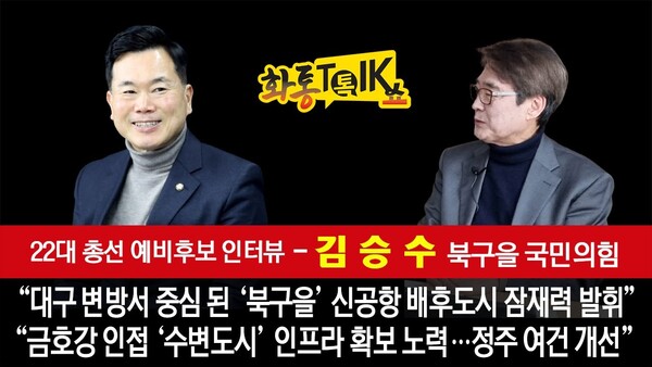 제22대 국회의원선거를 앞두고 치러진 국민의힘 ‘3인 경선’에서 과반 득표로 재선 도전을 확정 지은 김승수 대구 북구을 예비후보가 TK(대구·경북) 통합신공항 배후도시이자 금호강 수변도시인 북구을의 발전을 약속했다. 지난 4년 동안 국회 문화체육관광위원회 위원으로 활동하면서 문화·체육 인프라 확장을 중점적으로 공략했던 김 예비후보는 국토교통위원회 소속으로 도심 재생과 교통망 확충 등에도 역할을 수행하고 싶다는 뜻을 내비쳤다.