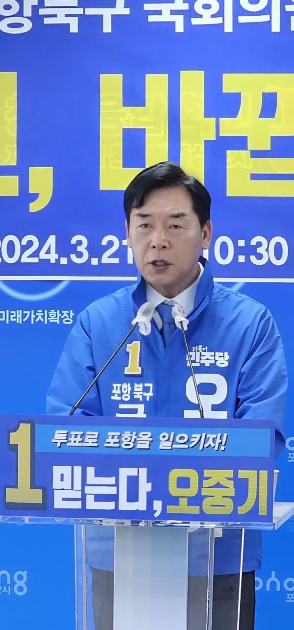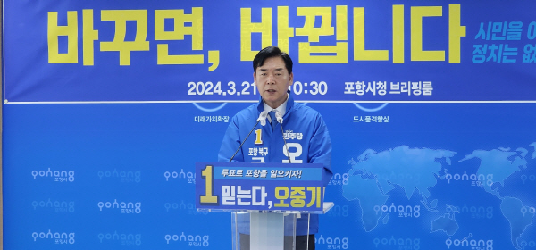 오중기 22대 총선 포항북선거구 더불어민주당 후보는 21일 후보 등록을 마친 뒤 포항시청에서 ‘포항시민께 드리는 호소문’이라는 주제로 기자회견을 열었다.