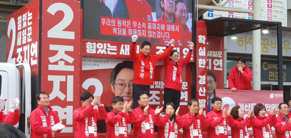 22대 총선 경산선거구 국민의힘 조지연 후보는 4일, 하양공설시장에서 박근혜 전 대통령의 최측근으로 잘 알려진 대구 달서구갑 국민의힘 유영하 후보와 함께 집중 유세를 펼쳤다.