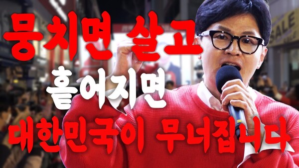 한 비대위원장은 이날 대구 동성로에서 “뭉치면 살고 흩어지면 대한민국이 죽는다”라고 목소리를 높였다.