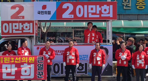 마지막 유세로 나선 국민의힘 이만희 후보는 “초·재선 경험 살려 대통령과 장관 등 중앙정부 누구 하고도 소통 잘하는 의원으로 영천 발전 앞당기겠다”며 “압도적인 지지로 힘 있는 집권 여당 3선 국회의원 만들어 달라”고 호소했다. 또 “마사회 이전 공약 쉽게 이루어지는 것이 아니다. 하지만 시민 모두가 뜻을 모으고 이만희와 함께 한다면 반드시 그 약속 현실로 만들어 내겠다”고 주장했다.