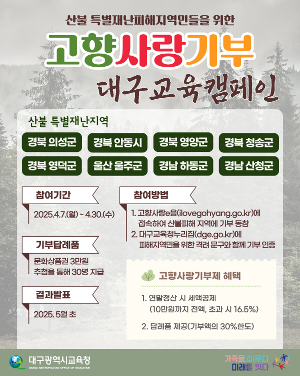 고향사랑기부제와 연계한 ‘고향사랑기부 대구교육 캠페인’도 오는 7일부터 30일까지 실시한다.