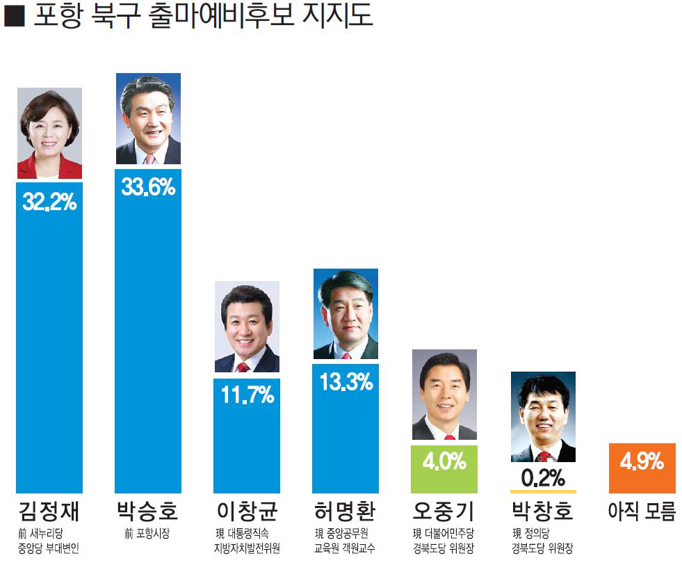 경북일보와 여론조사기관 폴스미스리서치가 9일 포항시 북구 만 19세이상(2015년 11월말 행자부 주민등록 인구 통계기준 적용) 성인남여 1천9명(표본오차 95% ±3.1%)을 대상으로 자동응답전화면접조사(지역·성·연령별 할당 후 유선 RDD 방식 표집·응답률 4.33%)를 한 결과 예비후보별 지지도가 새누리당 박승호 33.6%, 김정재 32.2%, 허명환 13.3%, 이창균 11.7%, 더불어민주당 오중기 4.0%, 정의당 박창호 0.2% 순으로 나타났다. 잘모르겠다고 응답한 부동층은 4.9%.