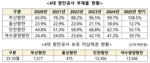 최근 항만공사들의 부채비율이 빠르게 치솟고 있는 것으로 나타났다.국회 농림축산식품해양수산위원회 정희용 의원(국민의힘, 고령·성주·칠곡)이 10일 공개한 ‘4대 항만공사 부채 현황 분석’ 자료에 따르면, 울산항만공사를 제외한 부산·인천·여수광양항만공사의 부채가 지속적으로 증가하며 일부 공사는 이미 ‘재무 경고등’이 켜졌다.특히 가장 눈에 띄는 곳은 부산항만공사다. 부채비율이 2020년 65.0%에서 2021년 78.2%, 2022년 88.2%, 2023년 96.5%, 2024년 99.7%, 올해 상반기 기준 108.5%로 치솟으며 1