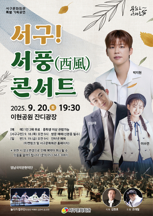 대구 서구문화회관이 가을밤을 수놓을 야외 음악회로 시민들을 초대한다.문화회관은 오는 20일 오후 7시 30분, 이현공원 잔디광장에서 ‘서구! 서풍(西風) 콘서트’를 개최한다고 밝혔다. 이번 공연은 매년 9월 열리는 서구 대표 브랜드 공연으로, 국악과 대중음악을 결합한 다채로운 무대로 지역의 가을 정취를 전한다.무대에는 영남국악관현악단(지휘 김현호)을 비롯해 가수 박지현·신승태·이수연이 오른다.맑고 순수한 음색으로 ‘트로트 신동’으로 불리는 이수연은 데뷔곡 ‘놀아보세’, ‘할매국시’ 등 국악풍 트로트를 선보이며, 성인 못지않은 기량으