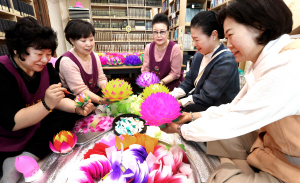 28일 오전 대구시 남구 한국불교대학 大관음사에서 다음 달 5일 부처님 오신 날을 맞아 신도들이 수제 연등을 제작한 후 정리하고 있다.