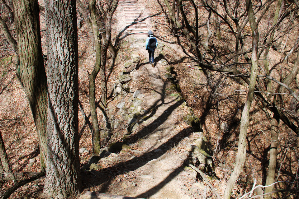 미곡동 자라미 입구에서 출발했다. 소나무 숲길이 이어졌다. 멀리서 개 짖는 소리가 들렸다. 작년 가을에 떨어진 이파리가 잘 튀겨진 과자처럼 바삭거렸다. 소리가 맛있어 일부러 활엽수가 쌓인 곳만 골라 밟았다. 애매한 표목으로 인해 길이 없는 곳에서 길을 찾느라 한참을 헤매다 왼쪽 도로로 내려섰다. 길과 어깨를 맞춘 개천엔 물이 졸졸 흐르고 논두렁엔 봄이 파릇하다.