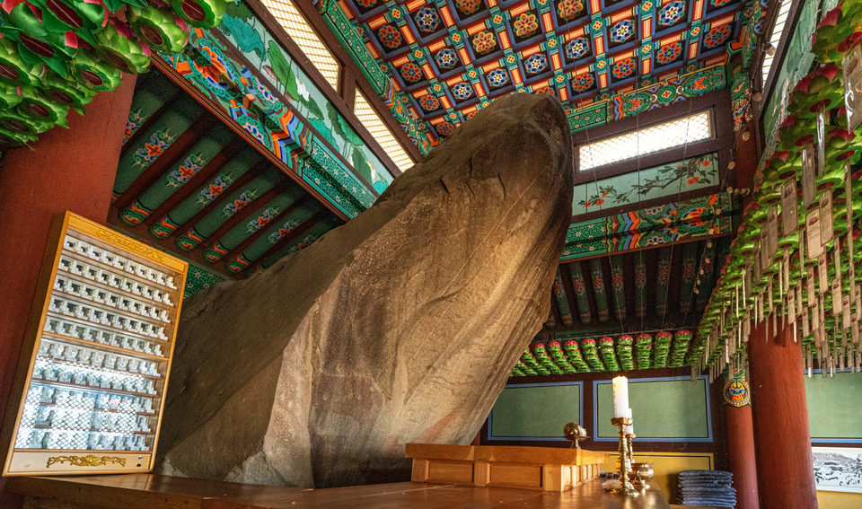 처음 보는 광경이다. 산중턱에서 시작한 거대한 바위의 물결이 해발 670m 정상 아래 절터까지 역류하듯 이어졌다. 계곡에서 무슨 일이 일어난 것일까. 돌무더기가 산 아래로 흘러내려 쌓일 것은 쌓이고 멈출 것은 멈추고 깨질 것은 깨지고 다듬어질 것은 다듬어져 바위의 바다를 이뤘다. 그 모습이 크고 작은 물고기들이 떼 지어 정상으로 오르는 모습 같았다. 바위들은 합체해 돌의 계곡 전체가 커다란 한 마리 고래로 변신해 산을 향해 올라 가고 있었다. 스페인 몬세라트의 푸니쿨라 산악기차가 연상됐다. 하늘에서 촬영한 사진을 보면 신비롭기 그지없다. 머리부터 몸통, 선명하게 갈라진 꼬리까지 한 마리의 고래 모양이다. ‘장자’ 첫 구절에 등장하는 북쪽 바다의 물고기 ‘곤(鯤)’을 떠올리게 한다. 곤은 몸의 크기가 몇 천 리나 되는지 모를 정도로 큰 고기다. 곤은 변해 ‘붕(鵬)이 되는데 한번 날갯짓에 구만리 장천을 날아간다.