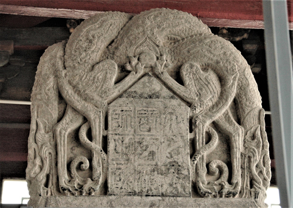 비액을 하나의 작품으로 보고, 전체적인 어울림을 살펴보자. 이수의 가운데를 규수형( )으로 공간을 확보하여 다듬은 다음, 직사각형의 틀을 2행으로 구획지어 각각 4자를 배치하였다. 글씨를 새긴 공간을 두 마리 용의 다리와 발이 에워싼 형세에다, 바로 위에는 ‘쌍룡이 여의주를 희롱하는 것(雙龍戱珠)’을 조각하여 비액에 대한 관심을 더욱 집중시켰다.