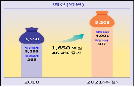특히, 타 자치단체와 경쟁을 통해 예산을 확보하는 공모사업의 경우 2018년에 19건, 233억 원에 불과하던 것이 2019년에는 30건, 627억 원, 2020년에는 47건, 842억 원, 2021년 현재 16건, 721억 원을 확보하는 등 매년 가파른 성장세를 이어가고 있다.