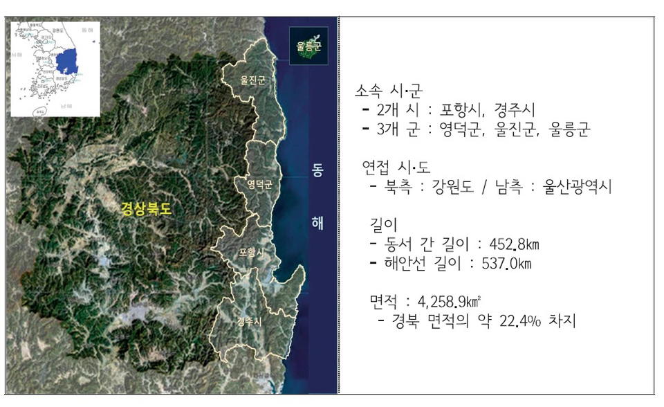 동해안과 접한 4258.9㎢ 면적의 포항시, 경주시, 영덕군, 울진군, 울릉군 등 5개 연안 시·군을 동해안권이라고 하는데, 경북 전체 면적의 22.4% 정도를 차지한다. 우리나라 동해안권 전체에서 경북권역이 537㎞로 가장 긴 해안선을 보유하고 있지만, 수심이 깊은 데다 해안선이 단조로워 개발이 어렵다.