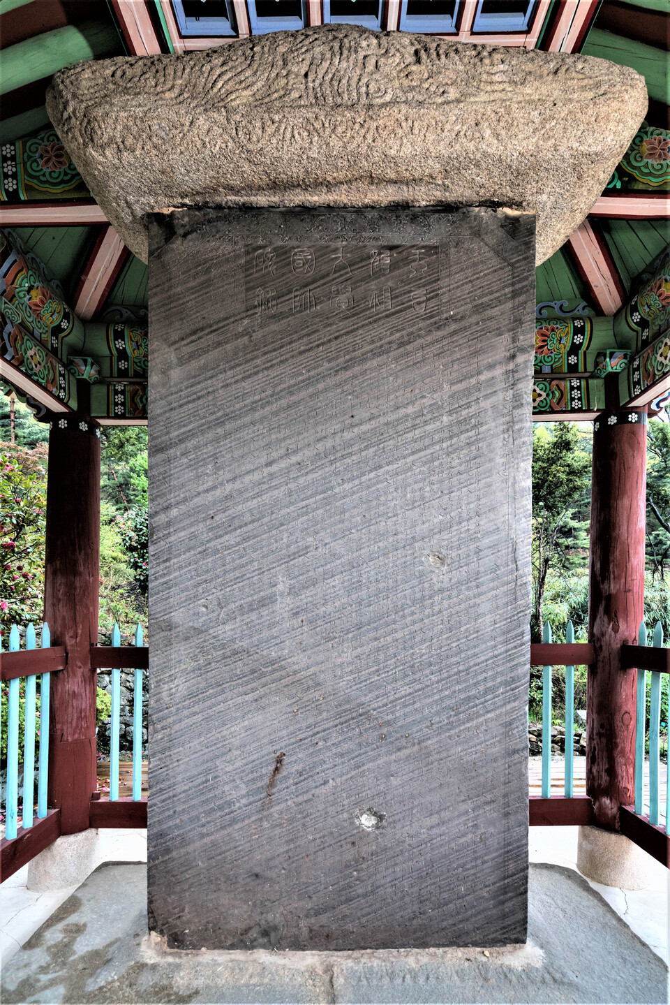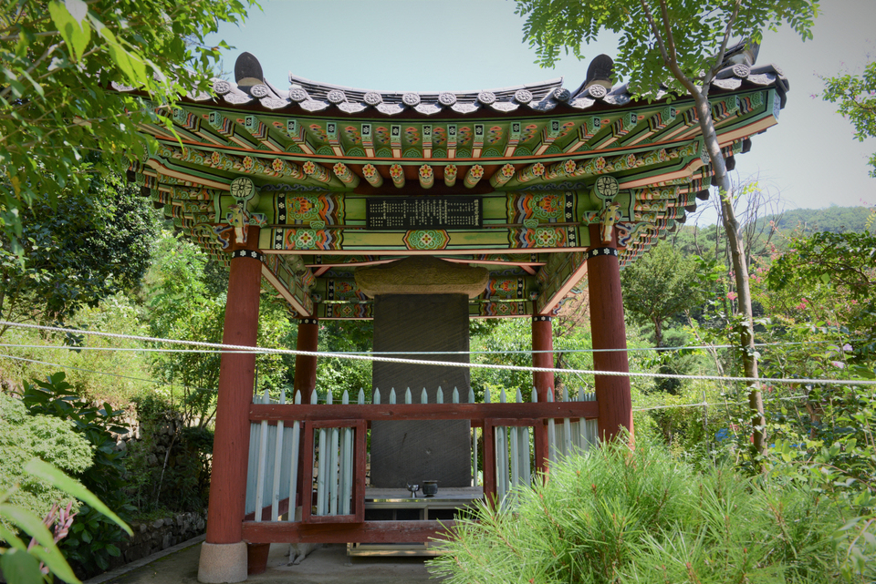 스님께 사진 촬영 허락을 받아 비각 앞으로 올라갔다. 비각 주변의 숲이 너무 우거져 사진을 찍기 어려웠다. 게다가 흰 밧줄로 비각 앞을 여러 번 둘러매어 놓이었기에 정면의 사진은 부득이 그대로 촬영했다.
