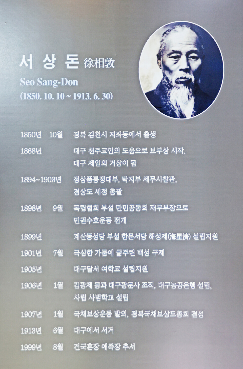 대구 중구 계산동 근대문화골목. 근대문화체험관인 계산예가 옆에는 민족 저항 시인 이상화 선생의 고택이 있고, 이상화 고택 맞은편에는 애국지사 서상돈 고택이 있다. ‘국채보상운동의 거장, 서상돈 고택’이라는 제목의 안내판에는 대구를 중심으로 일제로부터 국권을 찾고자 나랏빚을 갚자는 모금활동인 국채보상운동의 중심에 섰던 서상돈의 삶의 터전이고, 그의 애국심을 보여주는 유서 깊은 곳이라는 설명이 새겨져 있다.