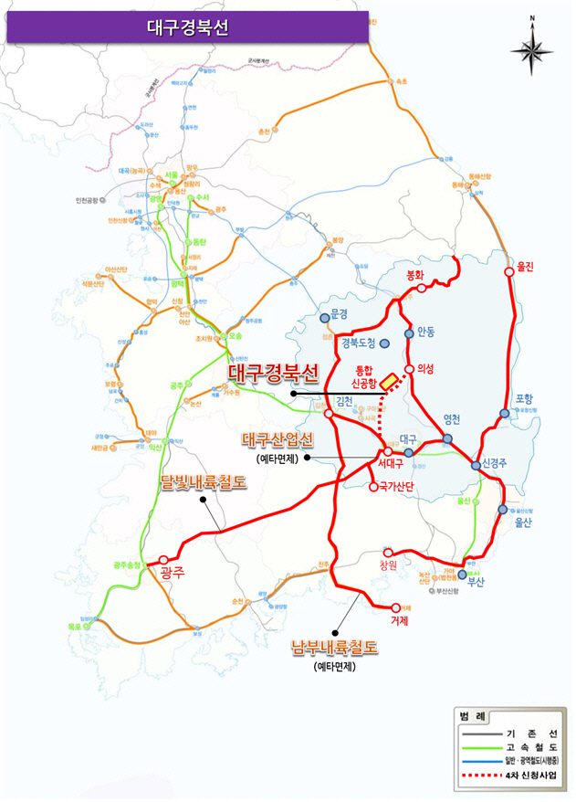 우선 신공항을 경유하는 대구경북선(서대구~의성)은 4차 국가철도망 구축계획(2021~2030년)에 반영됐다. 대구시와 경북도는 철도망 구축계획 당시 대구경북선이 일반철도로 반영을 요구했지만, 결국 광역철도로 결정됐다. 광역철도는 국가와 지자체가 사업비(건설비)를 7대 3, 차량 구입비는 5대 5로 부담해야 한다. 운영비(연간 308억 원 추산)는 지자체가 전액 부담한다.