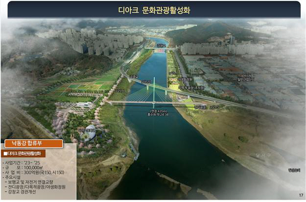 첨단복합산업단지로 개발되는 금호워터폴리스 거점에는 수변 무대와 횡단교량 등 ‘금호워터프론트’가 조성될 예정이고, 낙동강 합류부는 올해는 선도사업으로 폭 8m·길이 435m의 연결 교량 설치하는 ‘디아크 문화관광 활성화’ 사업이 추진된다.