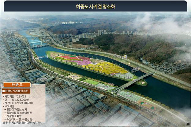 유채꽃과 코스모스로 사랑을 받는 하중도에는 앞서 추진된 명소화 사업을 마무리되고, 유람선과 전동보트 등을 활용한 사계절 명소화 사업과 하중도 복합문화단지 조성 사업이 진행될 예정이다.